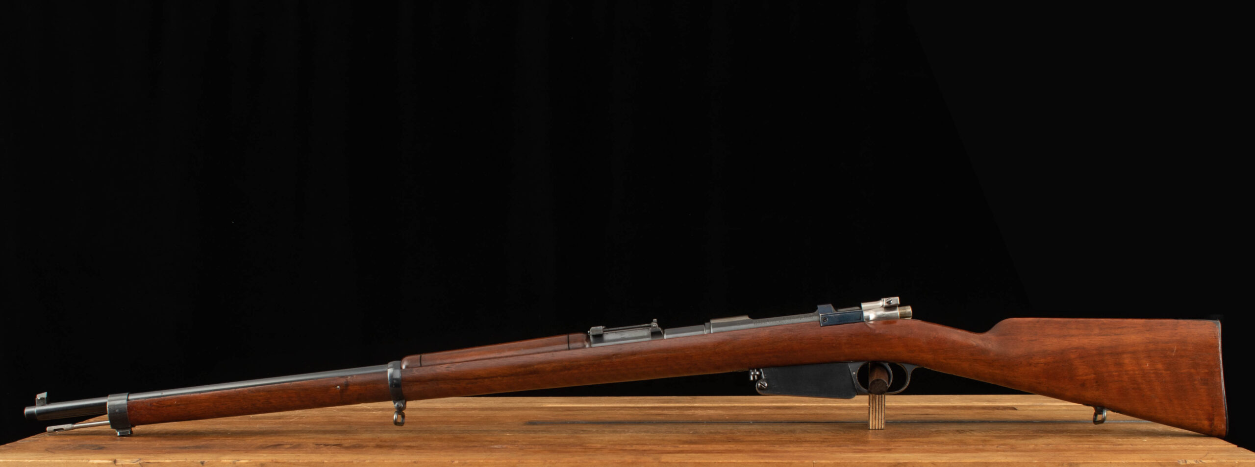 Vintage Firearms is pleased to present this Mauser Modelo Argentino 1891, one of the highest regarded Mauser Variants. In the late 19th century Argentina began the process of modernizing its military arms in 1886, after ordering 180 thousand rifles and 30 thousand carbines chambered in 7.65×53mm from Mauser for the purpose of replacing the by then outdated single-shot Remington Rolling Block rifles. These rifles designated the Modelo 1891 and produced by Ludwig Loewe and later DWM, rifles remained in police service up into the 1960s. This example, serial number S1436 was manufactured circa 1899 by DWM. The barrel retains 98% factory finish, the receiver and bolt retain 90% factory finish, and the crest has been removed. This rifle has matching serial numbers on the receiver, barrel, stock, bolt, magazine, and cleaning rod, The bore is mint. A great choice for any militaria collector and are just a blast to shoot! Have a look at the detailed specifications and pictures below. Thanks for looking!
