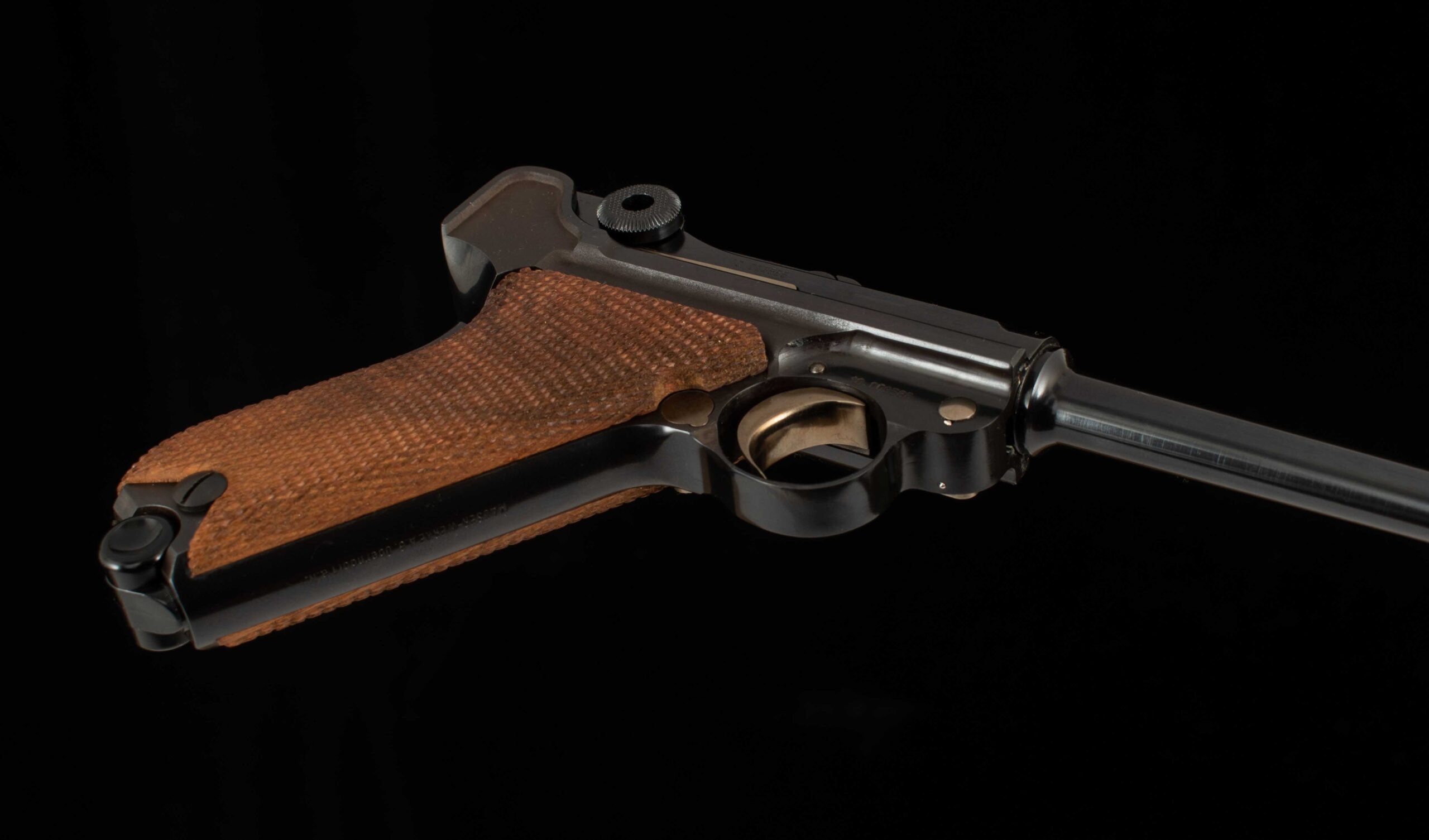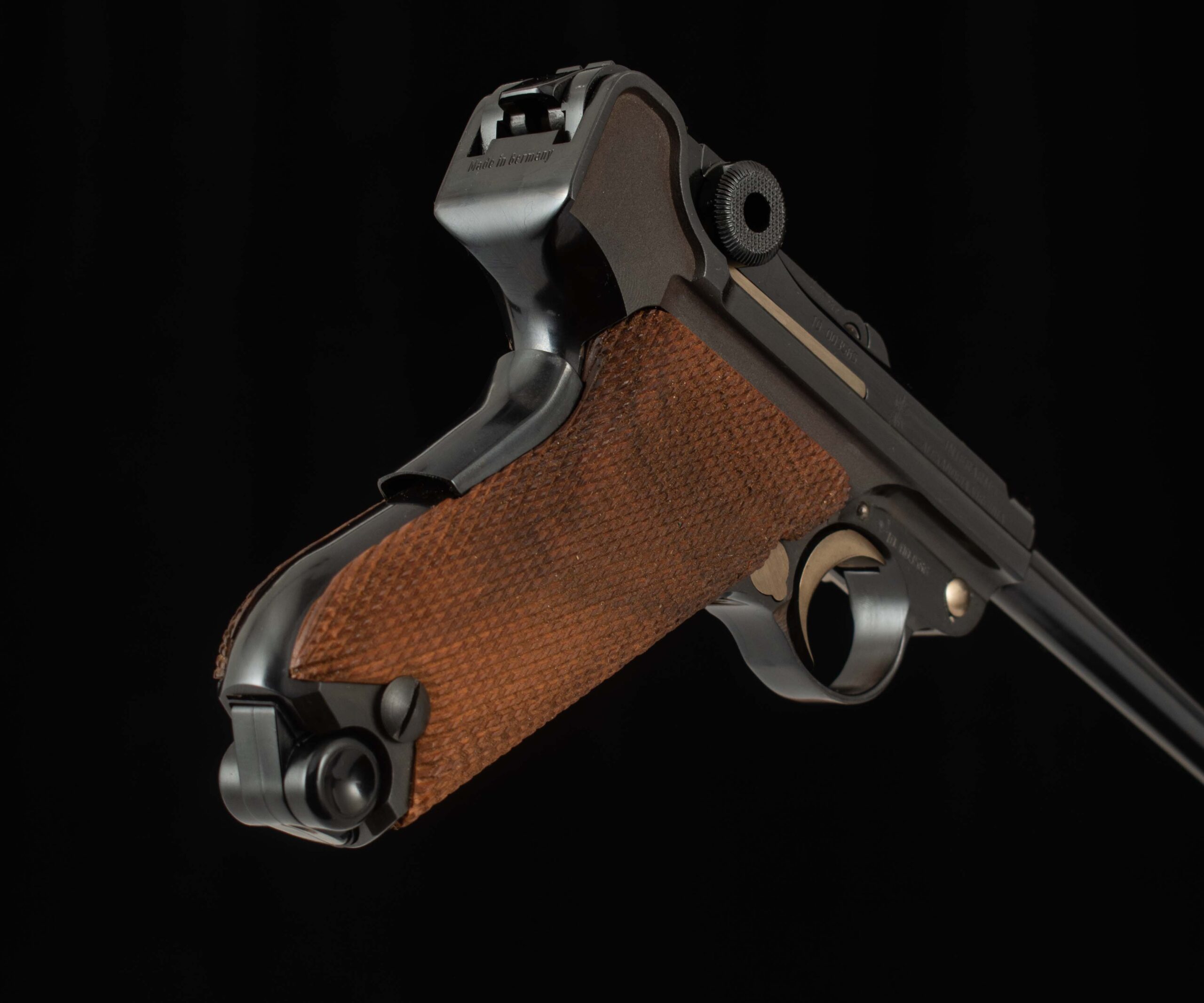 Vintage Firearms is pleased to offer the ever-iconic P.08 Luger, appearing in countless films and video games and became sought after trophies by allied soldiers. The origins began with DWM’s request that George Luger improve upon Borchardt’s C93 and thus the Classic P.08 was born. The P.08 Luger’s enduring legacy prompted a 1970s revival by Interarms and Mauser. Since the original German tooling was lost, Mauser used the Swiss Model 1929 as a template for this production known as the Mauser Parabellum American Eagle. This version featured a 1911-style grip safety, an American Eagle crest over the breech, and featured a higher standard finish than its wartime predecessors. Mauser eventually ceased production in the later half of the 1970s making them rather exclusive. This example serial number 10.003566 is chambered to fire .30 Luger and apart from the factory test fire is unfired! It comes with its original box, presentation case, documents, and accessories. Don’t let this German classic get away! Vintage Firearms invites you to have a look at the detailed specifications and pictures below. Thanks for looking!
