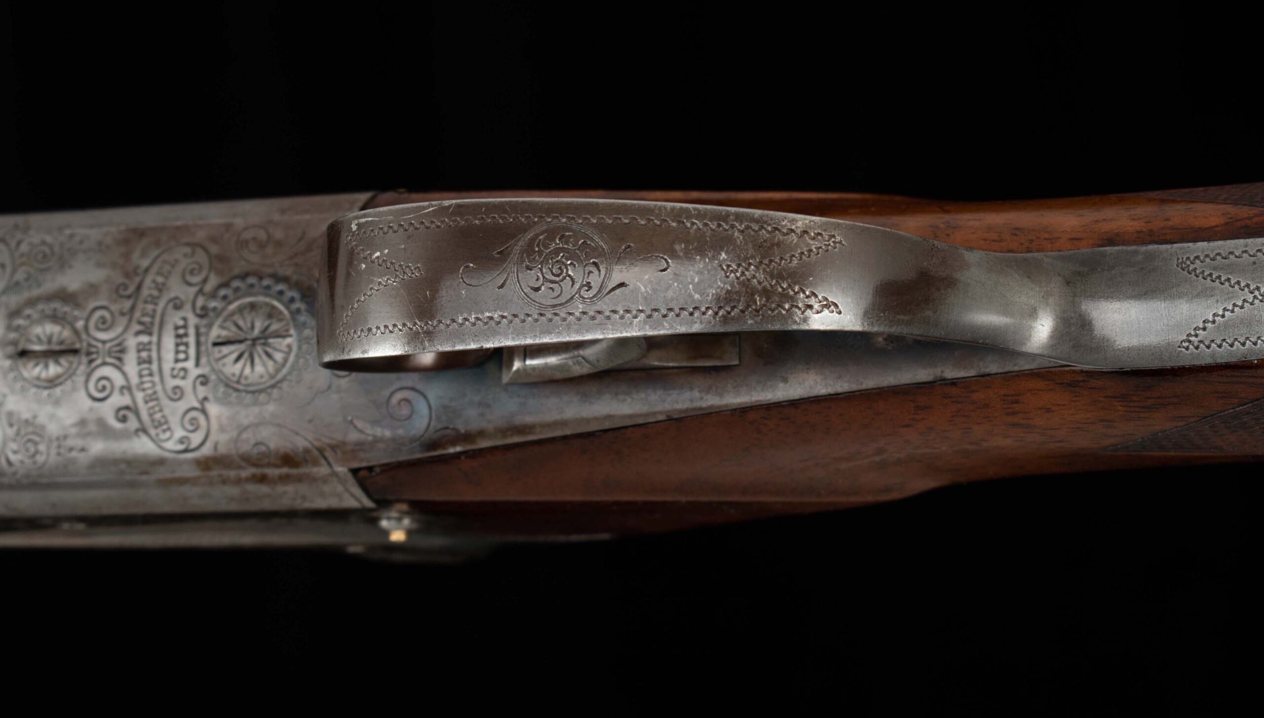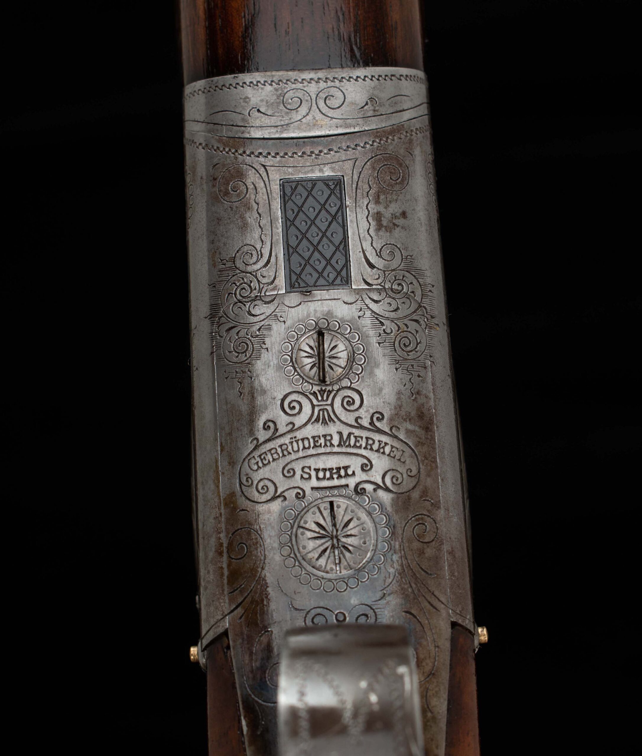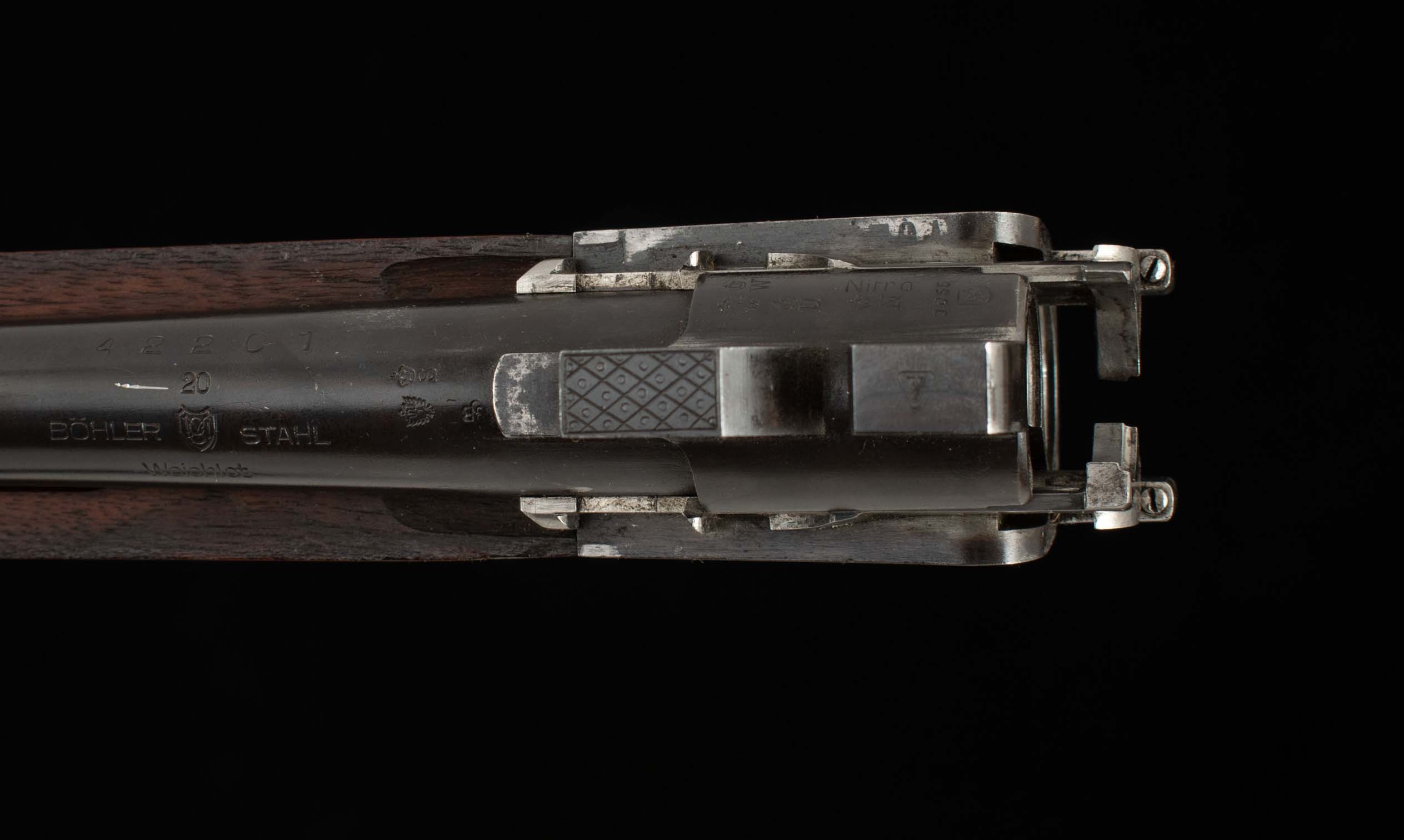 | General Specs: Merkel, 1955, 20 Gauge, 6lbs. 5oz. Chokes CYL/M, LOP 14 5/16″, DAH 2 3/4″, DAC 1 9/16″ Serial Number: 42207 Merkel of Suhl Germany is an incredible gun maker. They make all manner of fine guns that run the gamut from entry level side by side guns to more elaborate, ejector over under guns. This example, built in 1955, weighing just 6lbs. 5oz. Combine that with a pistol grip and slim 3-piece forend and you have a fast, dynamic gun which can be carried all day with little fatigue. Choked CYL/M and factory chambered for 2 3/4” shells, this is an excellent forest gun for grouse and early season pheasants. This 50+ year-old is a fine example of fine German engineering shows with 99% barrel blue, 85% trigger guard aging to a pleasant patina, mirror shiny bores, ribs and action tight on the breech face, a Kersten crossbolt, tactile cocking indicators, and great stock dimensions. Areas of vivid case color remain, especially on the right side of the receiver and under the lever, with the rest of the receiver weathering to a pleasing silver and patina finish. Excellent checkering, deep rich wood color, and a professionally plugged sling mount (see Picture), and finished with Vintage Firearms best butt treatment- a leather covered Purdey-style pad – which is a $625 service at Vintage Firearms. This is our best grade of pad; it offers just the right amount of ‘slip’ when mounting the gun and the perfect amount of ‘stick’ when you are taking your shot. All this amounting to an attractive German made over/under with plenty of character and many hunts ahead of it. For more information we invite you to have a look at the pictures and specifications below. Don’t hesitate to call and make this one yours. Thanks for looking!