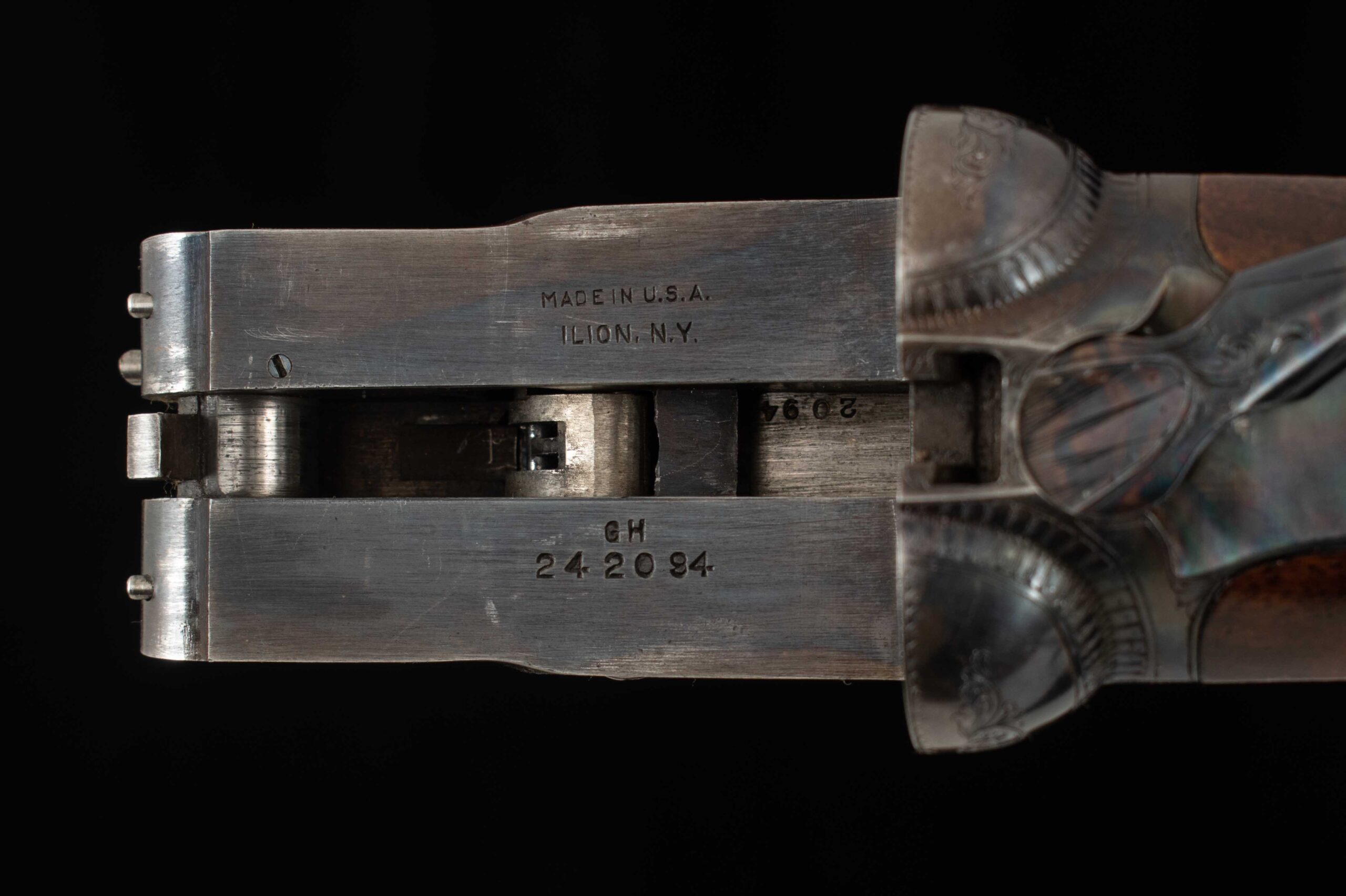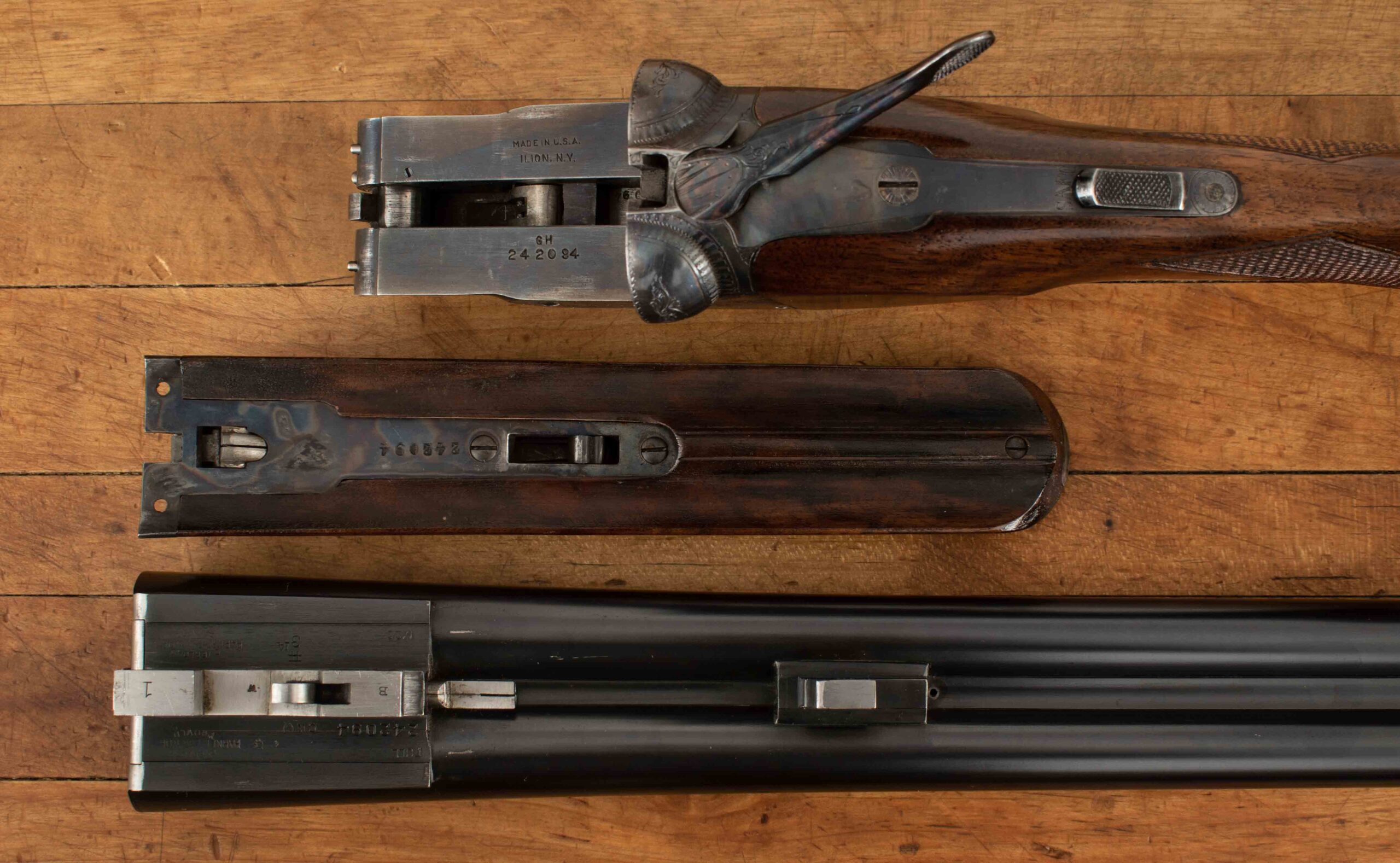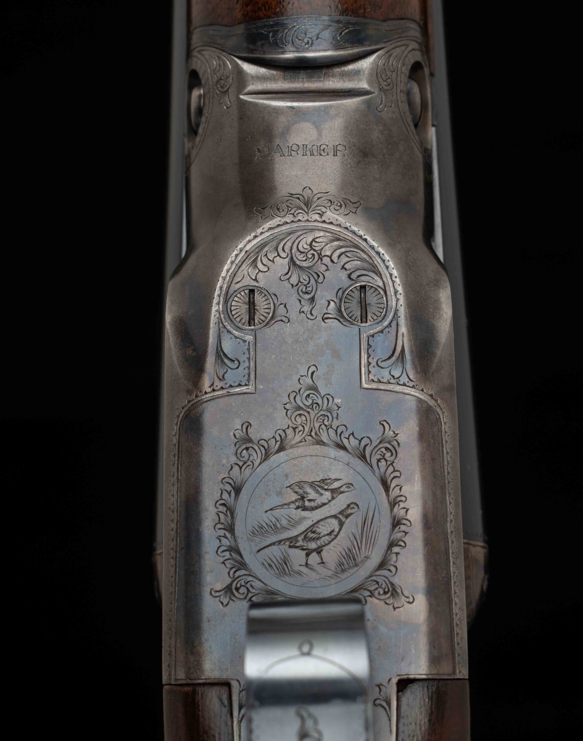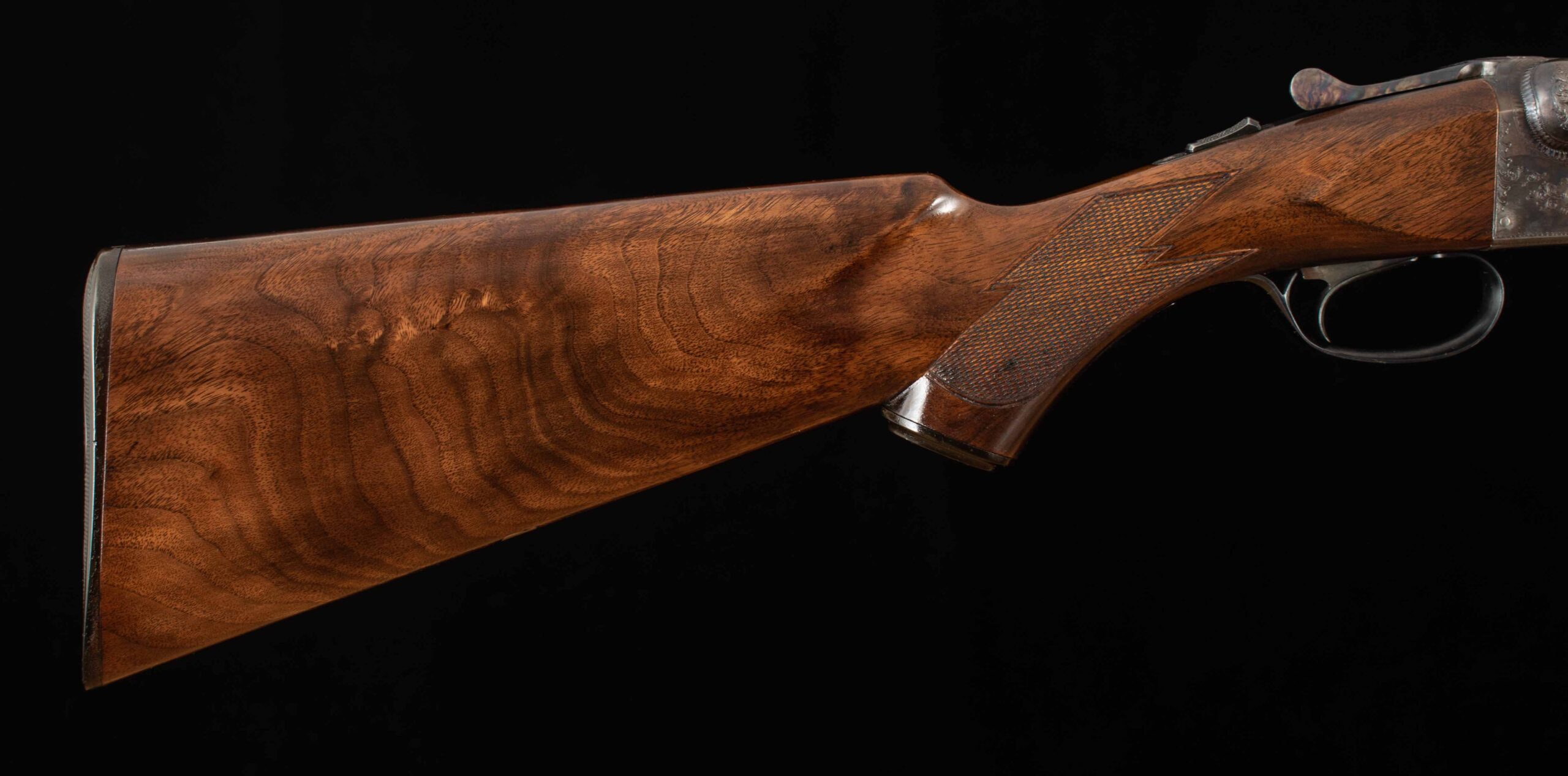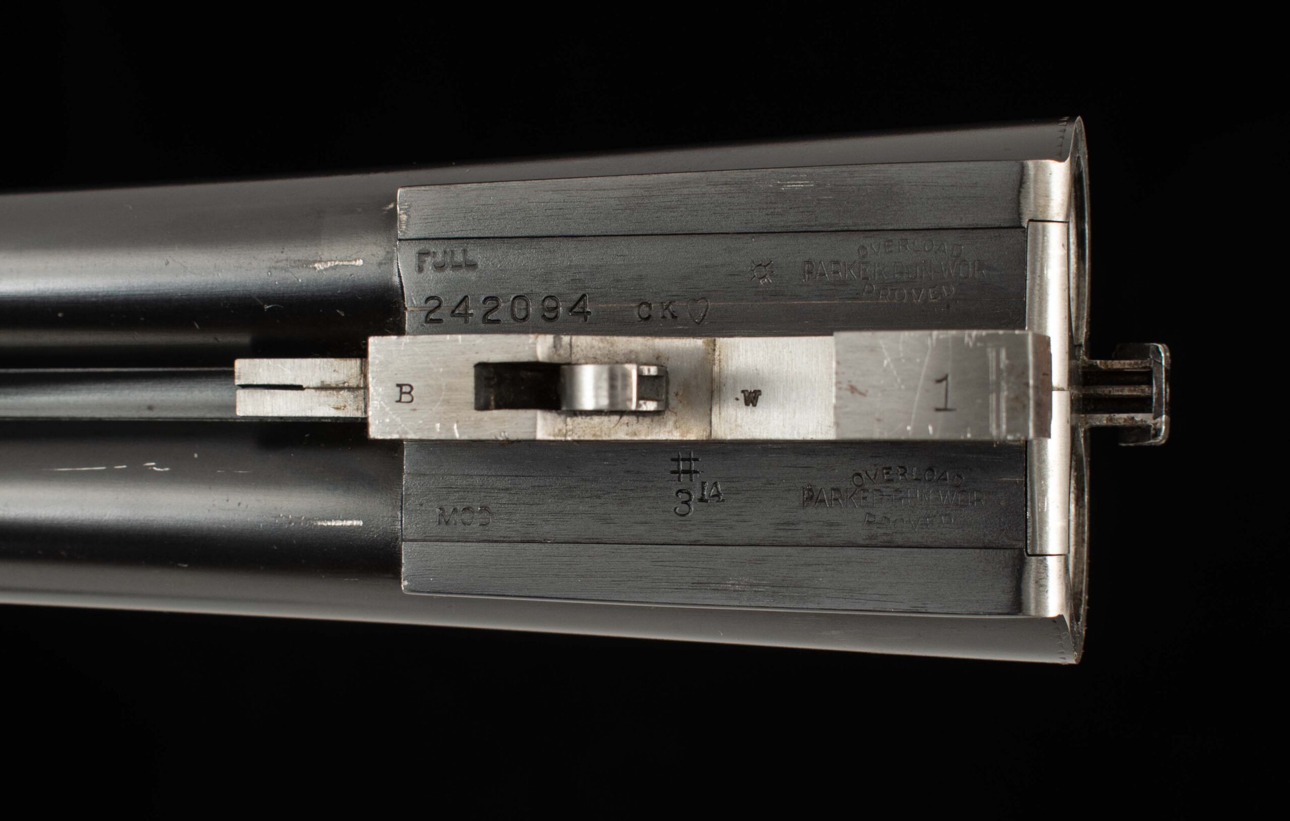 | General Specs: Parker, 1942, Gauge, Weight, Chokes M/F, LOP 14 3/8″, DAH 2 9/16″, DAC 1 1/2″ Serial Number: 242094