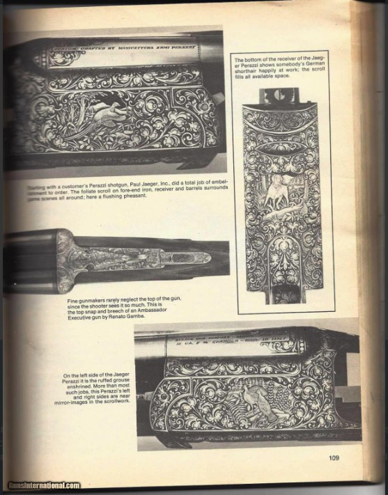 During the 1970’s Ithaca imported the Perazzi over/under. It is the Mirage model, which is essentially the same gun as the MX8 designation today with the dropout trigger group and interchangeable parts. The “LIGHTWEIGHT GAME GUN” version is rarely encountered and the lightest 12ga. over/under I have seen at 6lbs. 11oz. and balanced delightfully in hand, much like a fine English side by side. A custom gun created by Paul Jaeger, Inc. including the wood and the engraving, it is a stunning work of art. The engraving is deep relief and executed by world class artist Claus Willig. Google Willig’s name and you will find he is one of the best. This particular Perazzi, sn39141 is displayed in the Gun Digest’s “Book of Custom Guns” and is a one-of-a-kind masterpiece. Study the engraving in the photos and you will be amazed! There are few artists on the planet that could execute such work, and the cost would be more than we are asking for the gun! Mechanically excellent in every way, this is an investment grade shotgun that will appreciate in value as you enjoy its use.