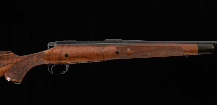 Type: left-hand; highly figured Euro walnut; shadow line cheek; ebony LOP: 13 1/2″ LOP To End Of Wood: 12 3/4″ Checkering Condition: superb; Fleur-di-lis Butt Treatment: Remington black pad |