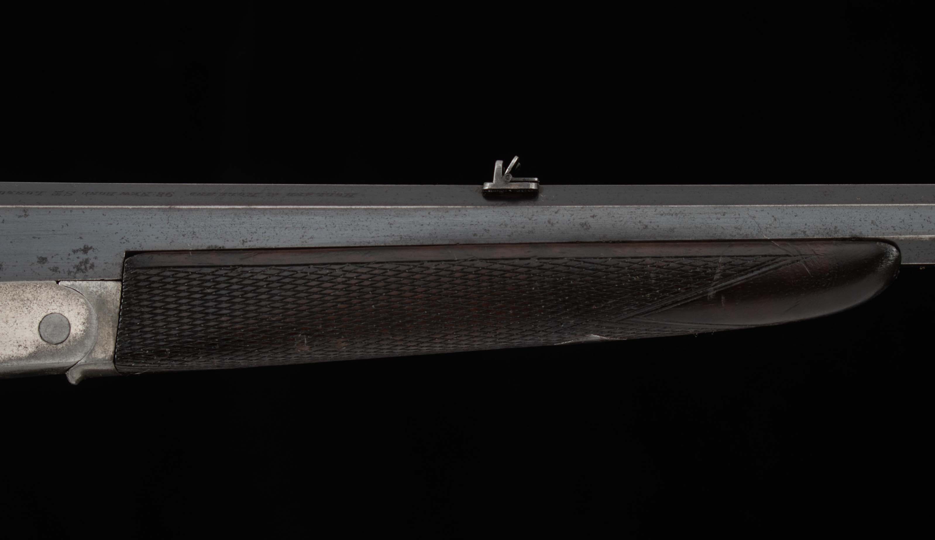 | Barrel Length: 22 1/2″ Bores: strong rifling, moderate pitting % Blue: 98% factory bluing Capacity: 1 Sights: front blade, rearward U notch |