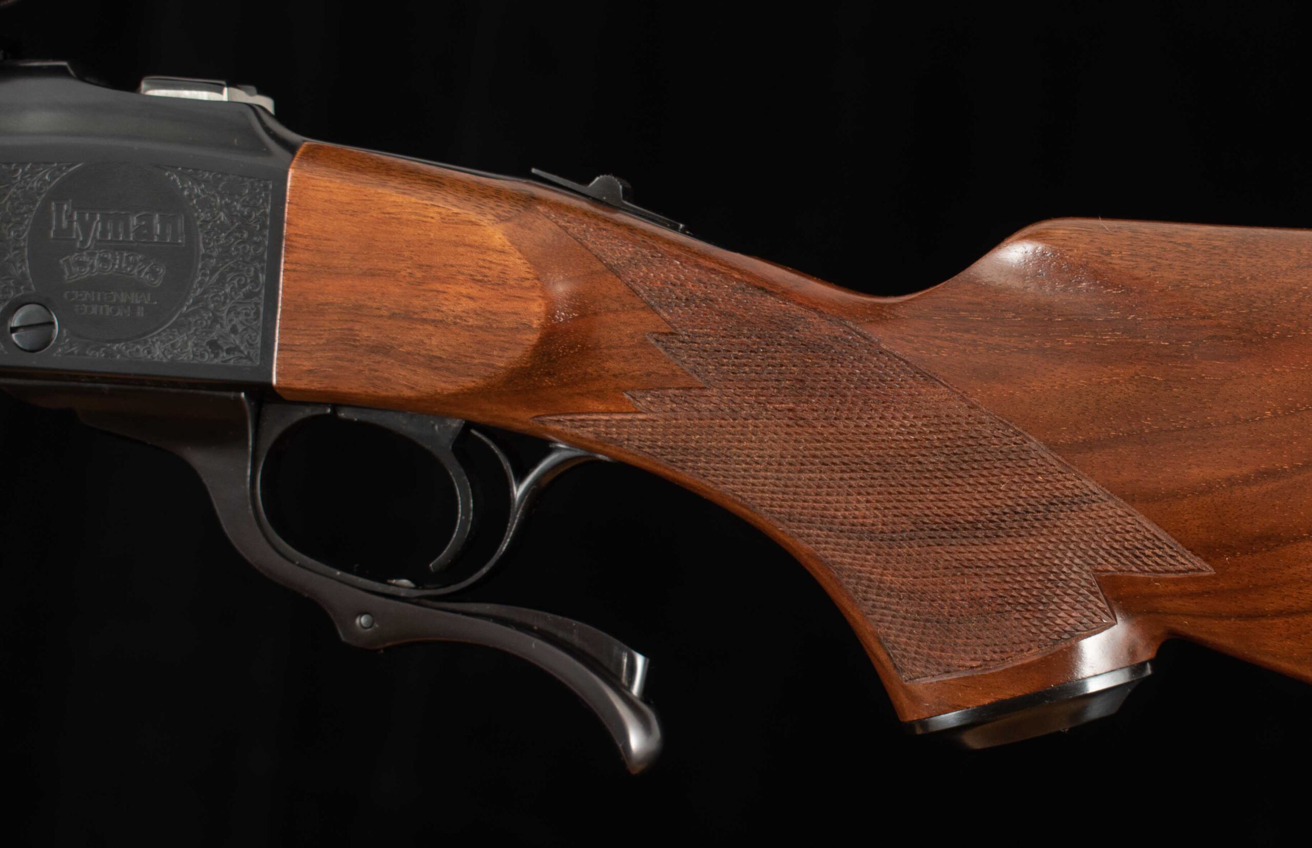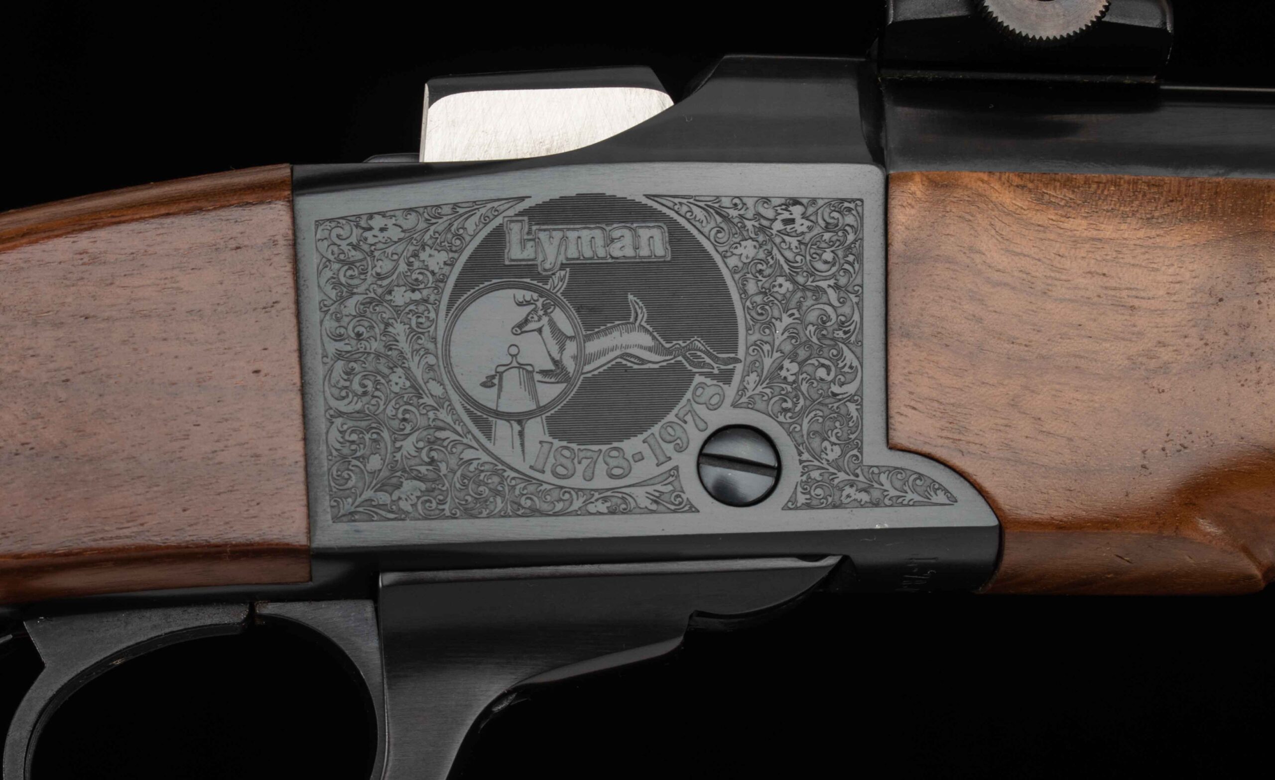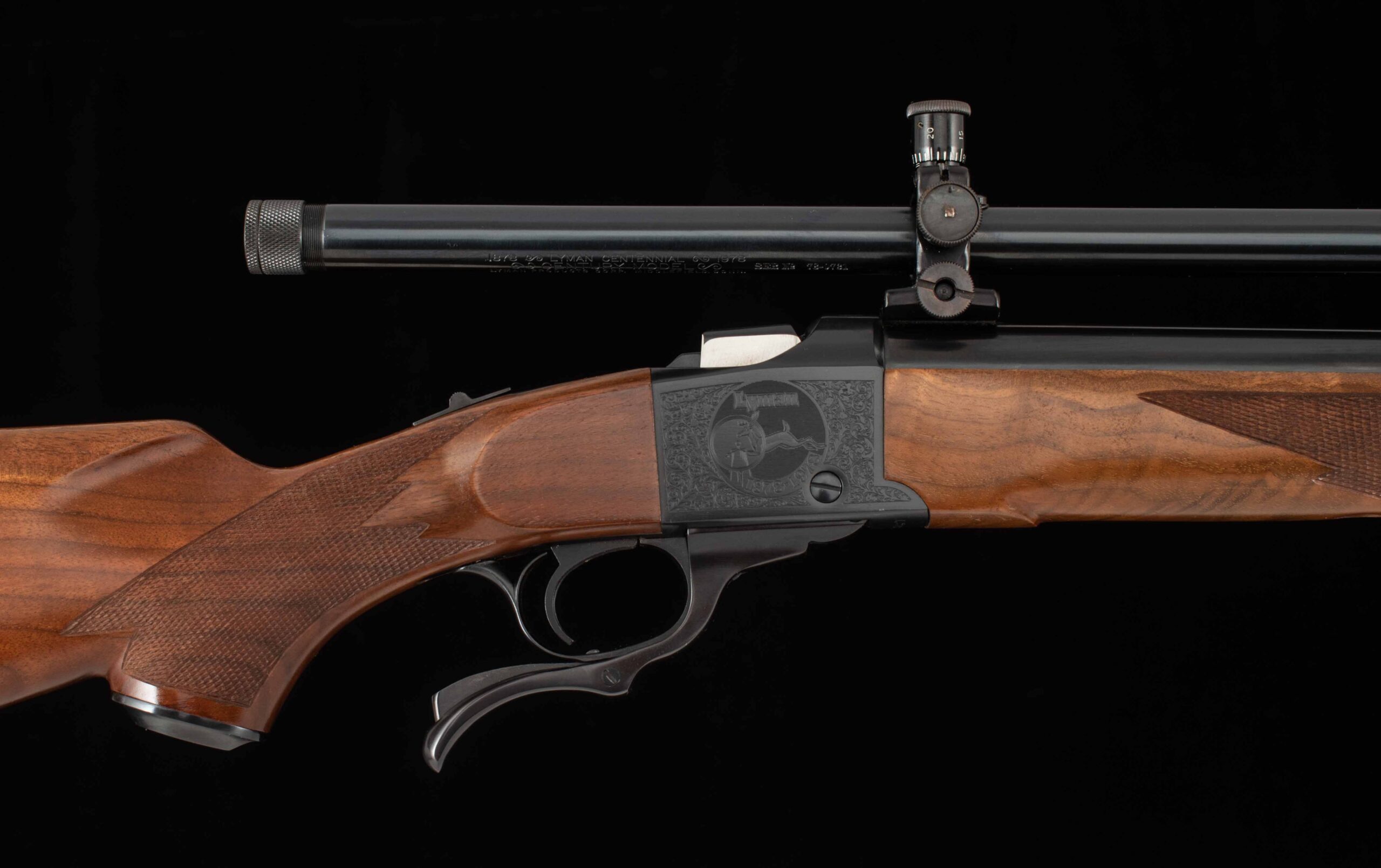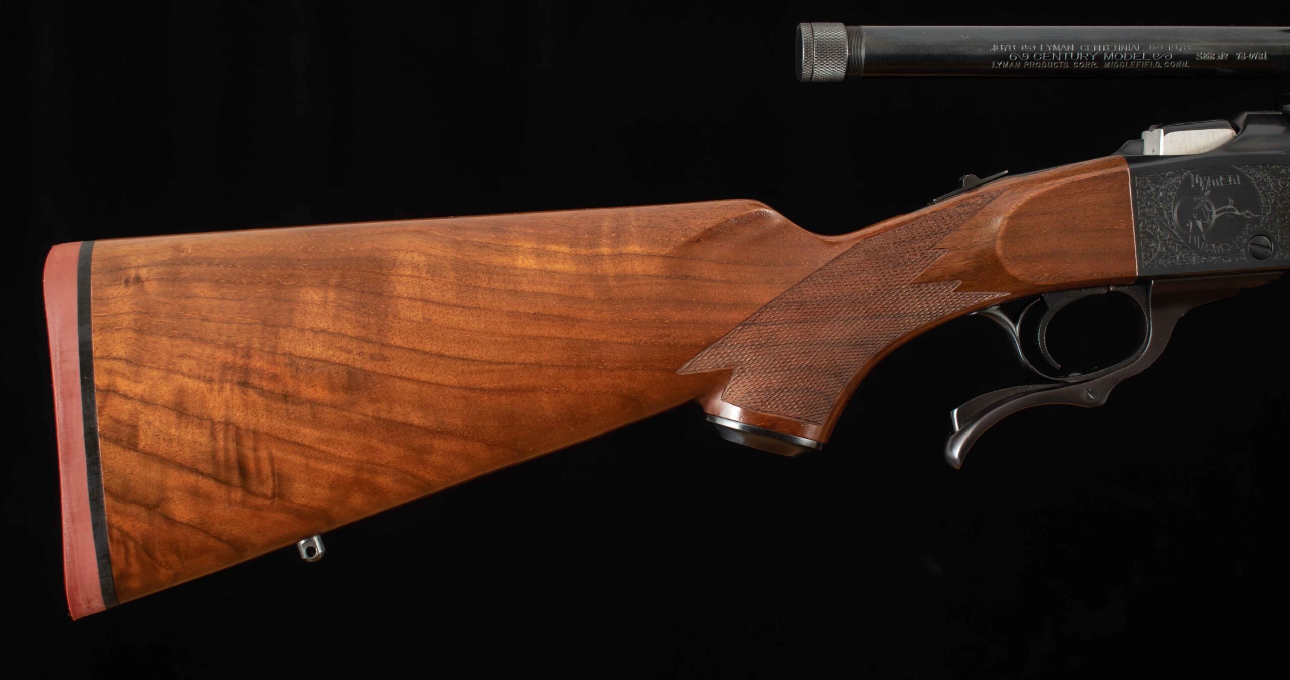 Vintage Firearms is pleased to offer this as-new Ruger No. 1 Lyman Centennial Edition. To commemorate Lyman’s 100th Anniversary two grades of rifles were made, Grade I and Grade II, and only 1000 grade 2 rifles were ever produced. This example serial number 131-45084 seems to be the 731st grade II centennial rifle produced and appears to be unfired and comes with its original wood case which shows some storage damage, All American 2-Die Rifle Set, accessories, and factory paperwork. On the falling-block breech there is no evidence of rounds ever having been cycled through. The 24” barrel has a perfect 10/10 mirror bore, 100% factory bluing, and features a 4X Centennial Model Lyman Scope mounted to the top of the barrel with Lyman mounts. On either side of the receiver is Lyman commemorative engraving, the left side reading “Lyman 1878-1978 Centennial Edition”, and the right side features a Buck being viewed through (presumably) a Lyman scope reading “Lyman 1878-1978” both surrounded by engraved art nouveau patterns. The receiver retains 99% factory finish and all showing screws are superb. The pistol grip stock and Alexander Henry style forend are made of nicely grained American walnut with perfect checkering. This is a great opportunity to add an accurate and reliable Ruger single shot rifle complete with its box and documents to your collection. Thanks for looking!