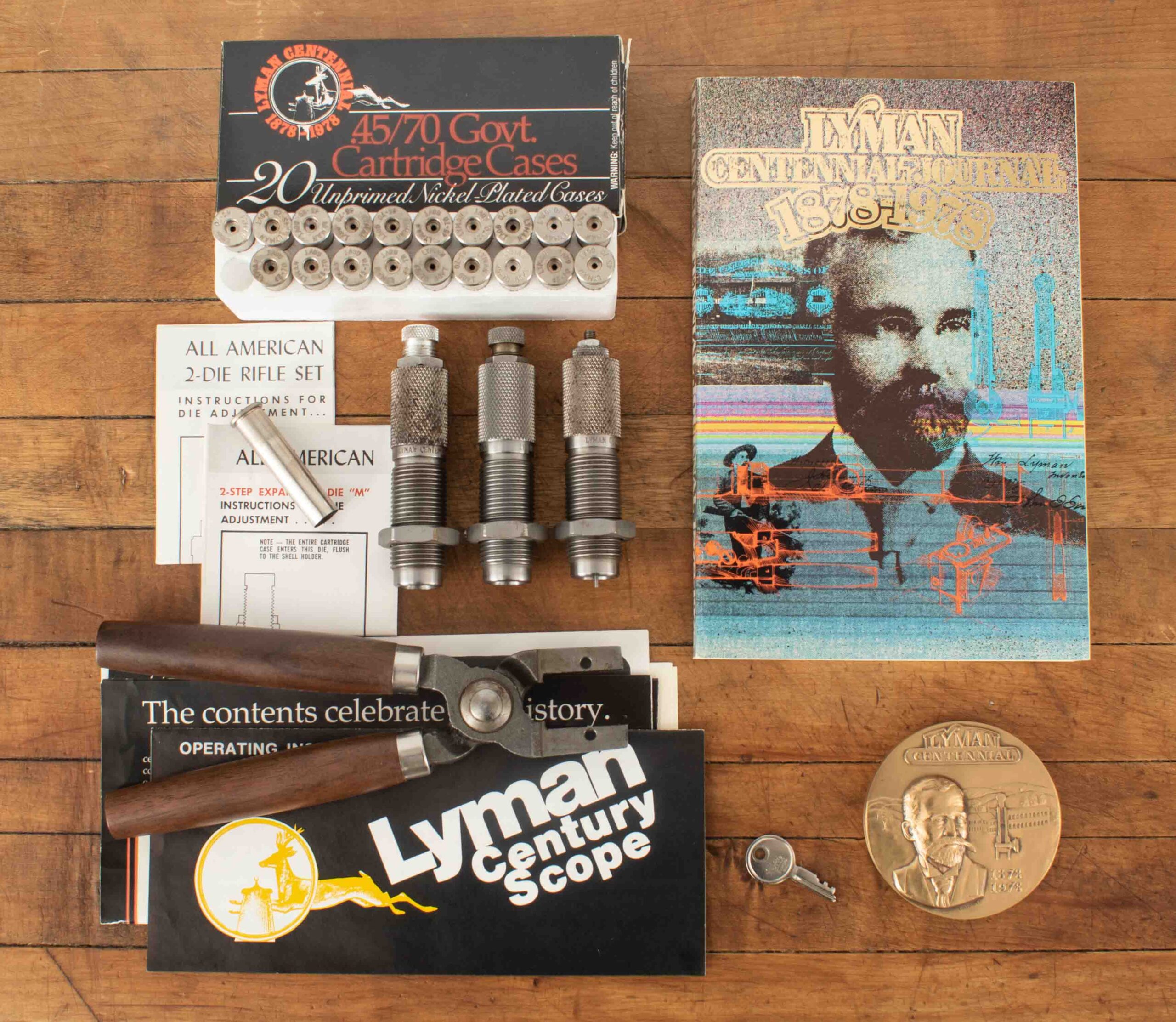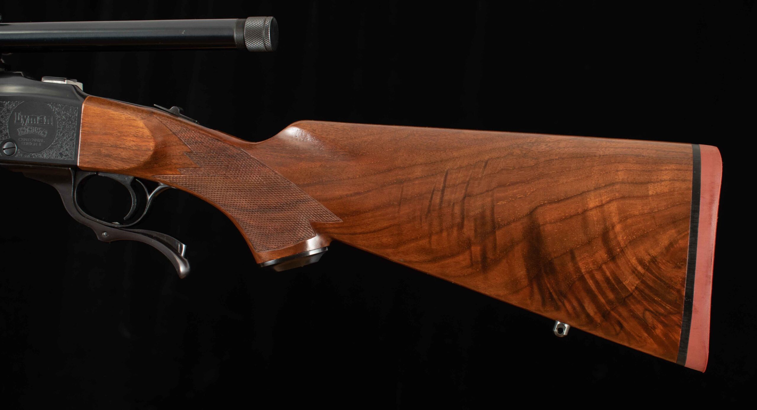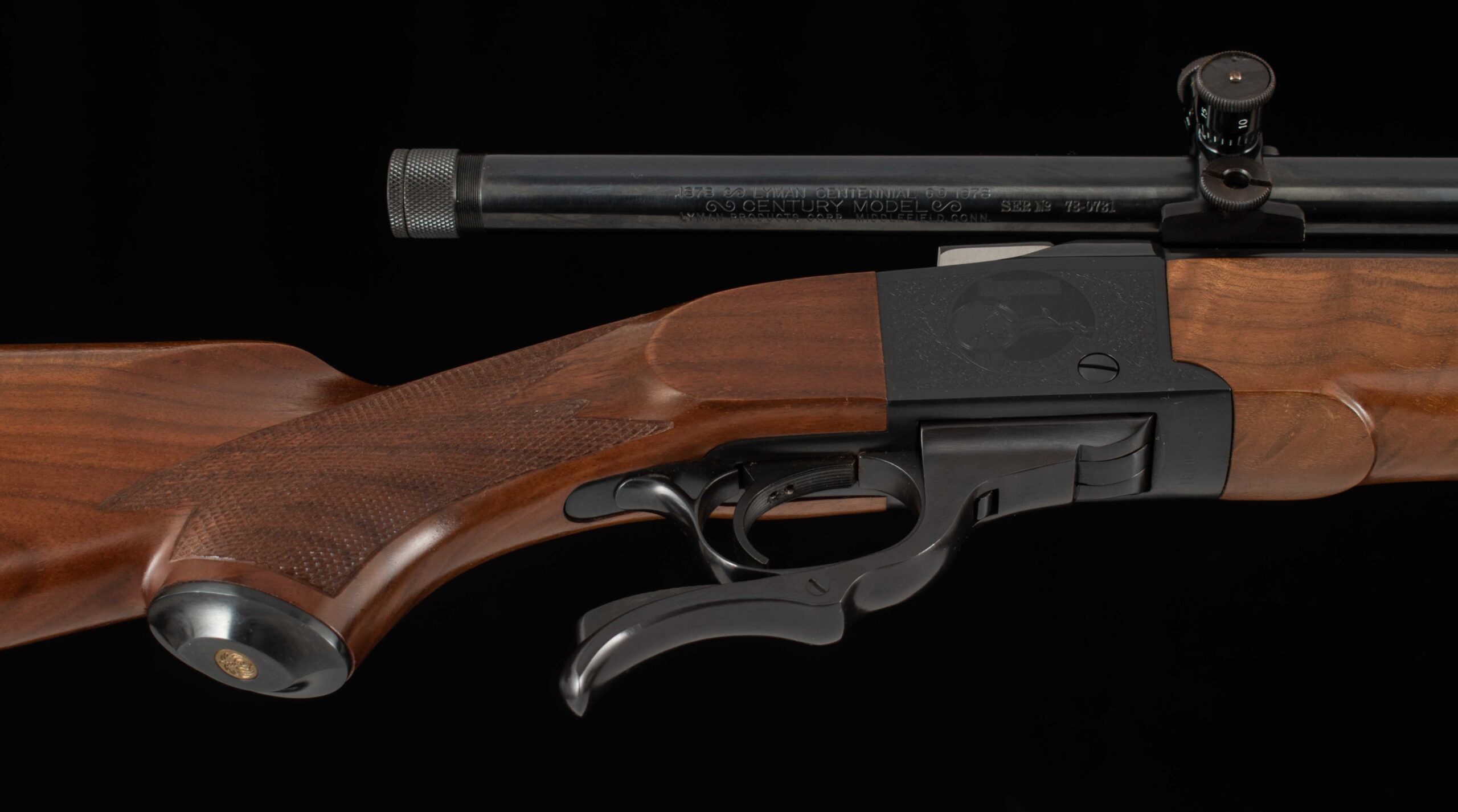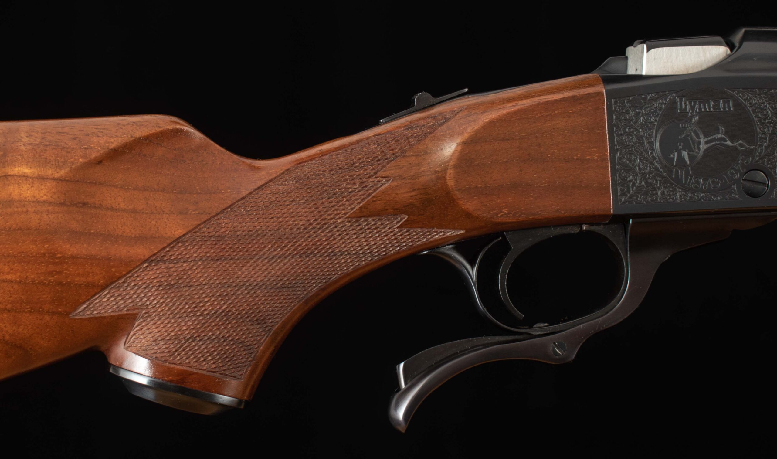 Vintage Firearms is pleased to offer this as-new Ruger No. 1 Lyman Centennial Edition. To commemorate Lyman’s 100th Anniversary two grades of rifles were made, Grade I and Grade II, and only 1000 grade 2 rifles were ever produced. This example serial number 131-45084 seems to be the 731st grade II centennial rifle produced and appears to be unfired and comes with its original wood case which shows some storage damage, All American 2-Die Rifle Set, accessories, and factory paperwork. On the falling-block breech there is no evidence of rounds ever having been cycled through. The 24” barrel has a perfect 10/10 mirror bore, 100% factory bluing, and features a 4X Centennial Model Lyman Scope mounted to the top of the barrel with Lyman mounts. On either side of the receiver is Lyman commemorative engraving, the left side reading “Lyman 1878-1978 Centennial Edition”, and the right side features a Buck being viewed through (presumably) a Lyman scope reading “Lyman 1878-1978” both surrounded by engraved art nouveau patterns. The receiver retains 99% factory finish and all showing screws are superb. The pistol grip stock and Alexander Henry style forend are made of nicely grained American walnut with perfect checkering. This is a great opportunity to add an accurate and reliable Ruger single shot rifle complete with its box and documents to your collection. Thanks for looking!