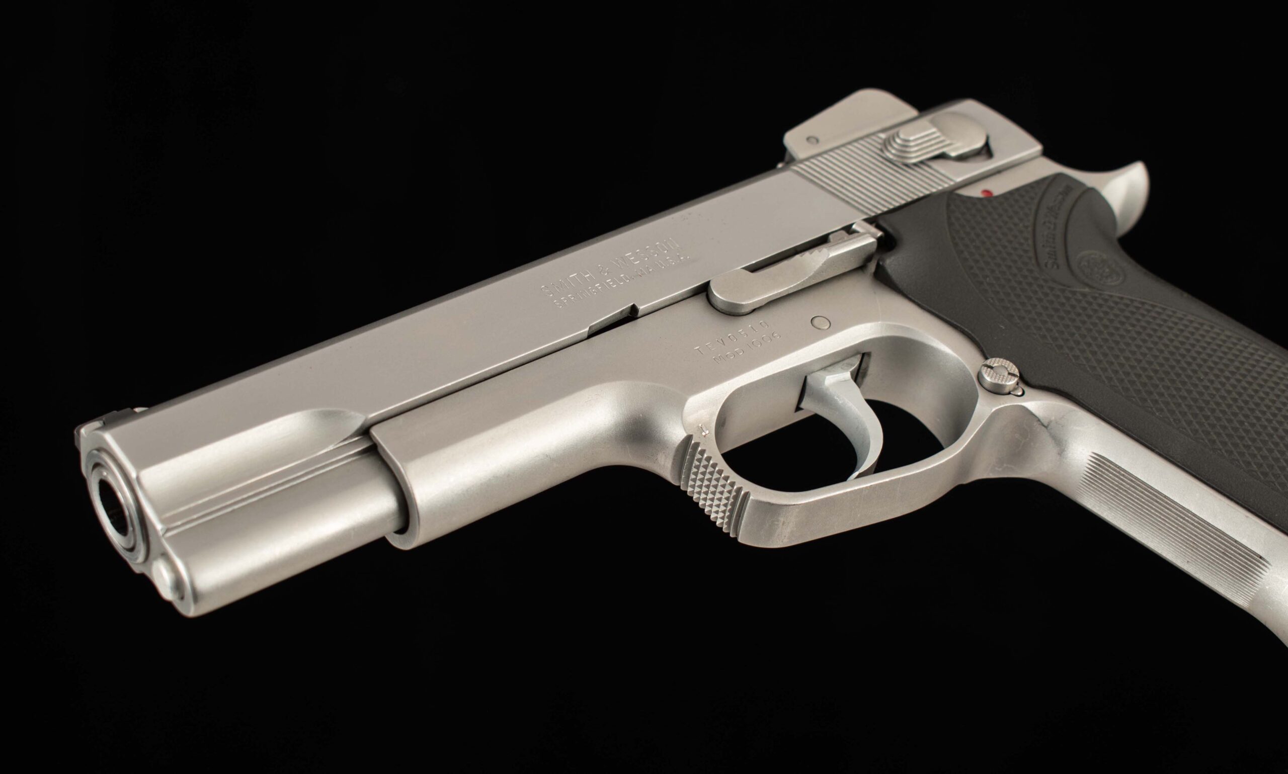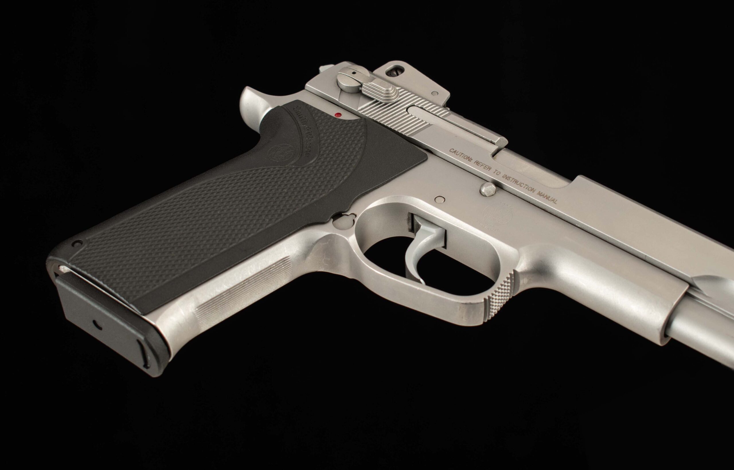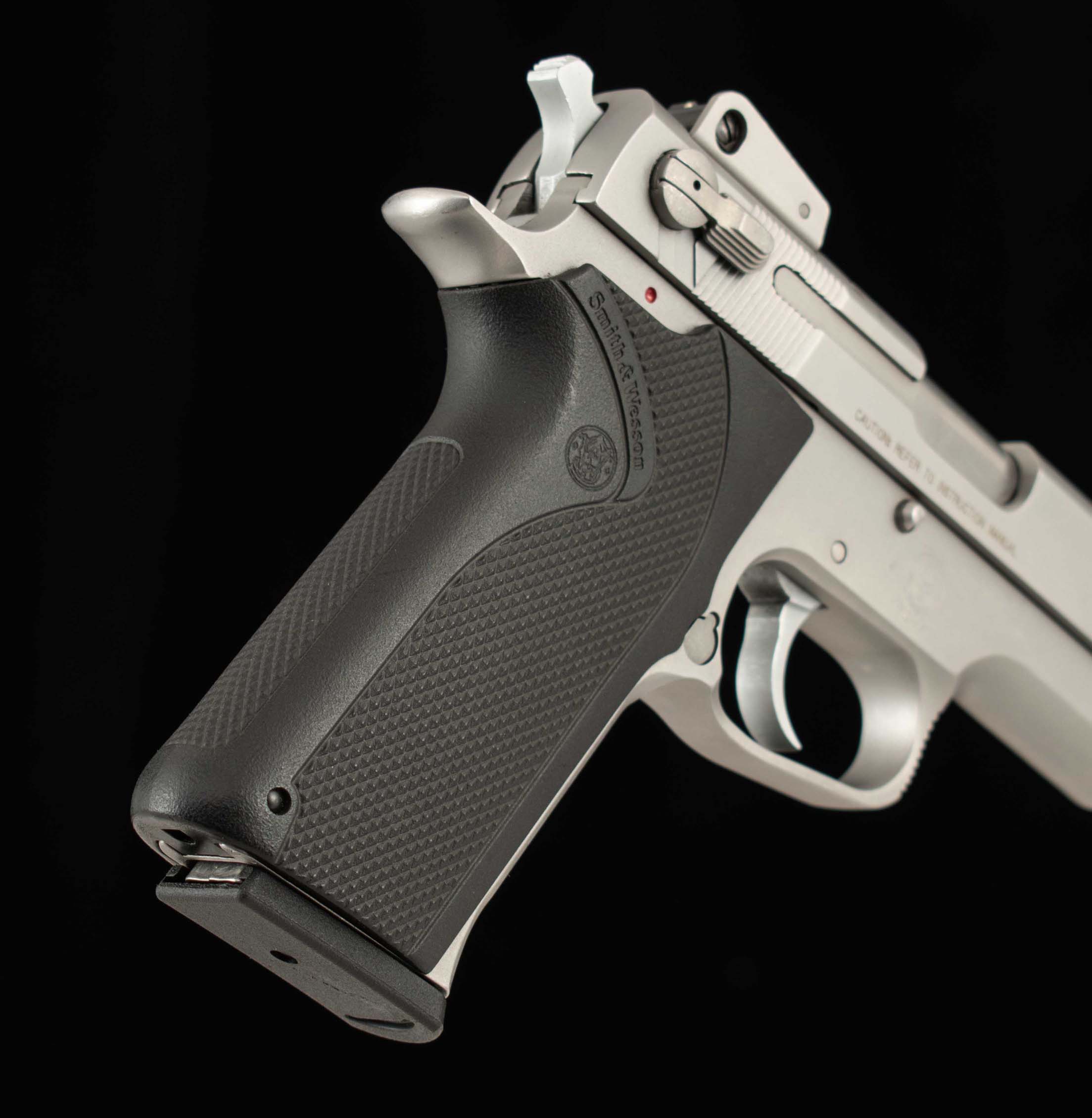 General Specs: Smith & Wesson, 1990, 10mm, 41oz., Barrel 5″ Serial Number: TEV0510 Vintage Firearms is pleased to offer this Smith & Wesson Model 1006 chambered for the glorious 10mm! Produced between 1990-1993, S&W manufactured 26,979 of these 10mm Double Action pistols. This example is serial number TEV0510, made in 1990. The gun is designed to be carried with a round in the chamber and de-cocked, with no safety to disengage the first trigger pull is in double action mode, subsequent shots are fired single action, until the operator de-cocks the pistol again making this a very fast pistol to get into action. This example is fitted with adjustable sights, protected by tall ‘ears’ that give this pistol is distinctive profile. This gun is in overall 98% condition with some rub marks on the stainless steel, and a mirror bore. The grips are in perfect condition. The gun comes with one 9 round magazine, and with one in the chamber that’s 10 rounds of the fearsome 10mm on tap! Thanks for looking!