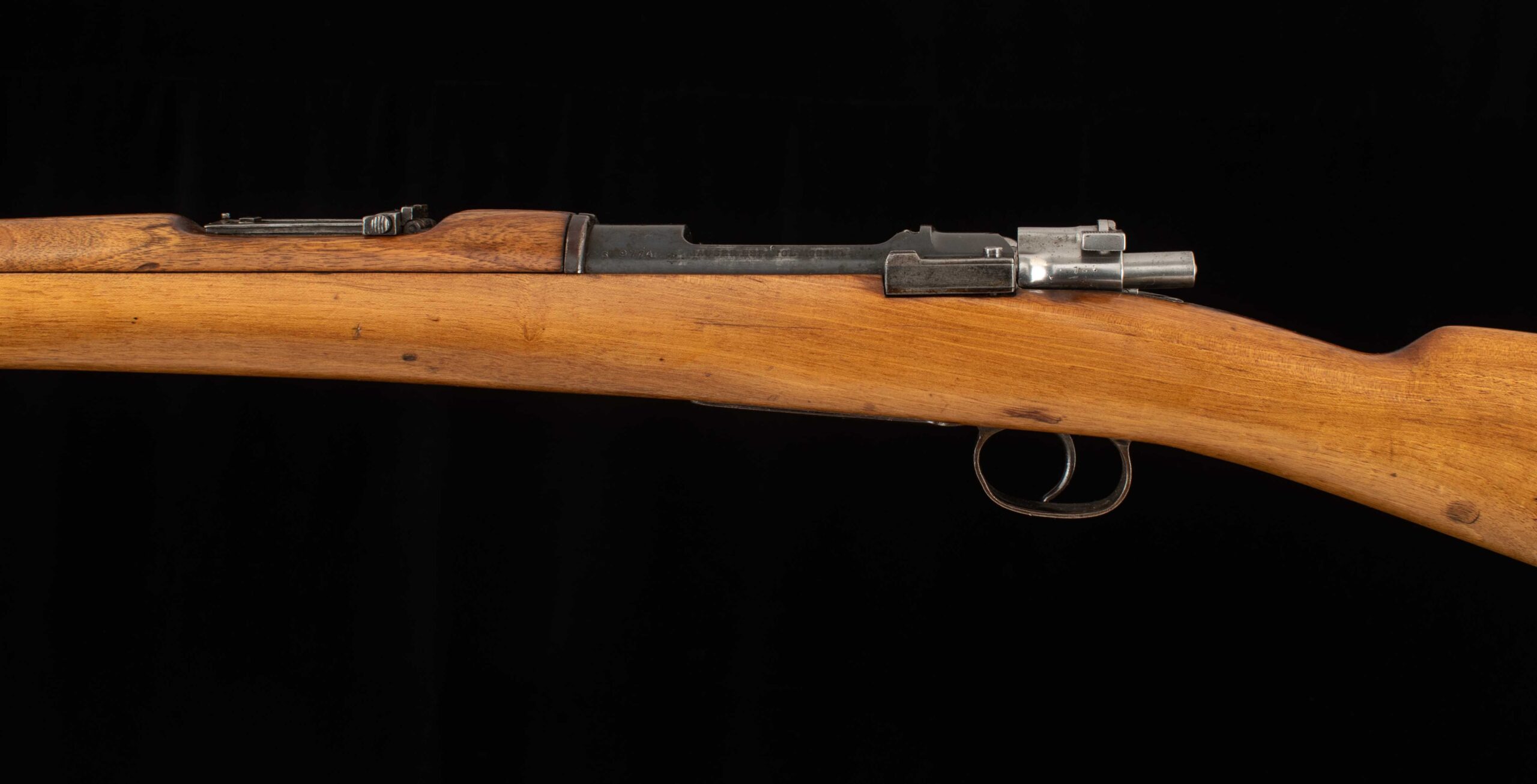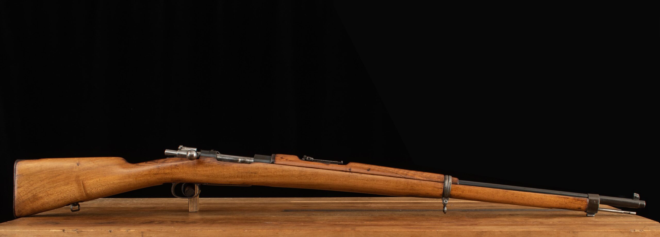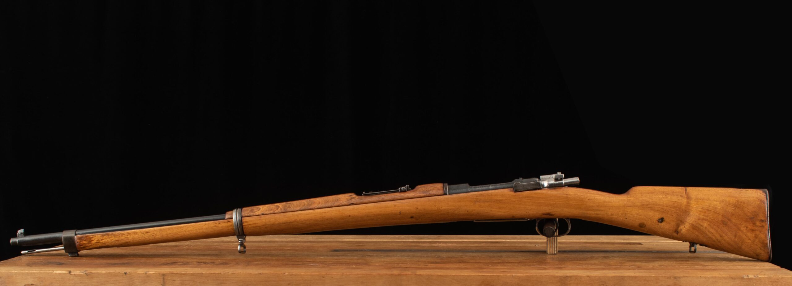 Vintage Firearms is pleased to offer this Mauser Model 1893 and is most notable for its service in the Spanish American war. As Spain’s empire declined in the late 19th century, it sought to modernize its military and adopted the at the time new Mauser Model 1893. The Mauser 93’s design introduced many of the features we today associate with Mauser rifles such as the long claw extractor, staggered internal magazine, and flag safety. The 93 performed well in the Spanish American War despite Spain’s defeat and directly lead to the US adoption of their own Mauser action rifle in the M1903. Beyond the Spanish American War, the 1893 saw use in Africa and in the Spanish Civil war, though outdated by the late 1930’s. This example, serial number S 9774 manufactured in Berlin and was most likely manufactured in 1896 by DWM, although, the date is difficult to make out. Please note the serial numbers on this rifle do not match, the receiver, bolt, magazine floor plate, and trigger guard all have different serial numbers. The barrel retains 98% finish, and the receiver retains 90% finish with rest fading to a pleasant silver. This Spanish Mauser would make an excellent addition to any militaria collection, especially if you already own a Krag and need a rival for it! Have a look at the pictures and detailed specifications and pictures below. Thanks for looking!