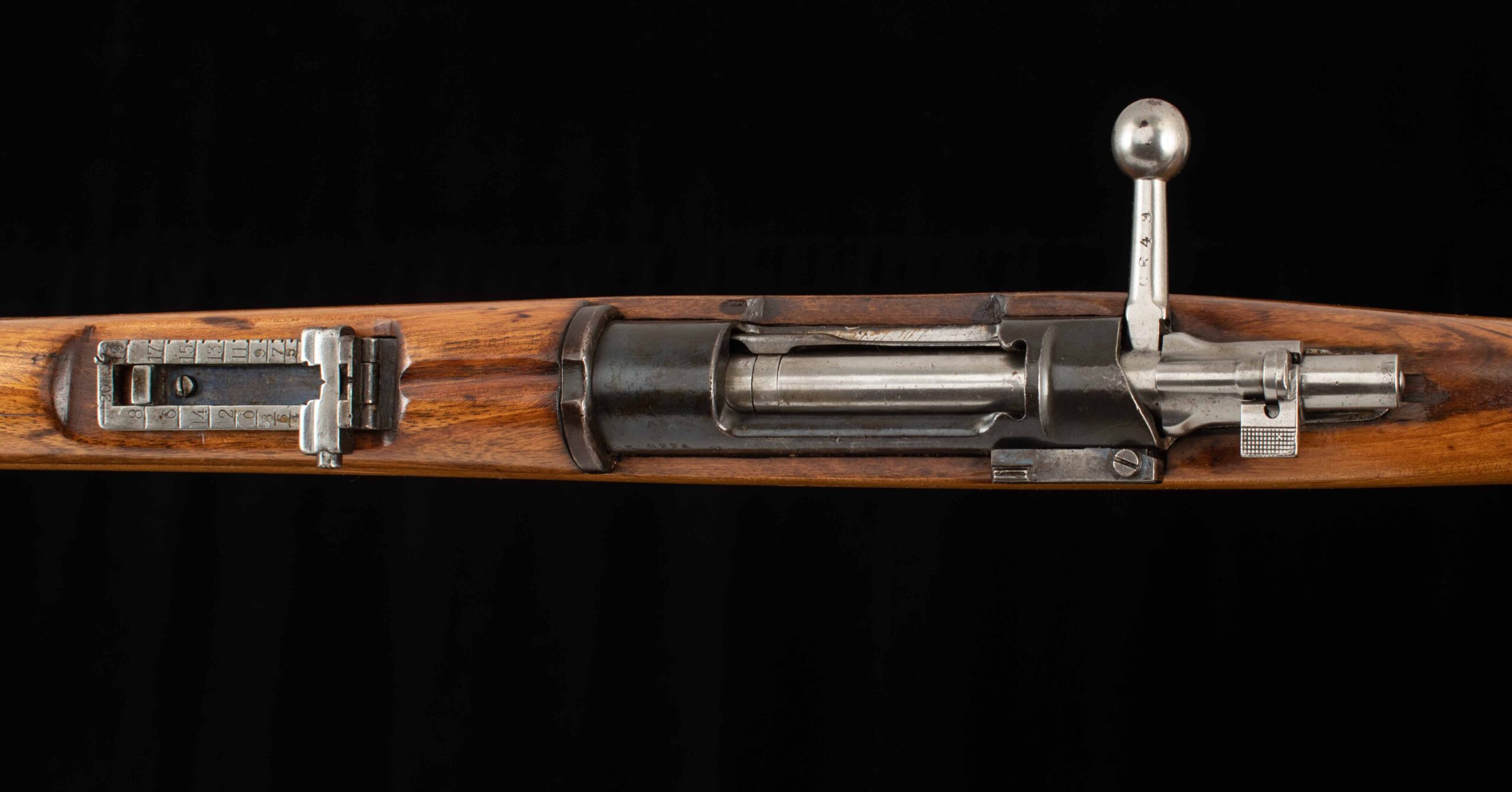 | General Specs: DWM, c1896, 7x57mm, 8lbs. 14oz. Chokes, LOP 13 3/8″ Serial Number: S 9774