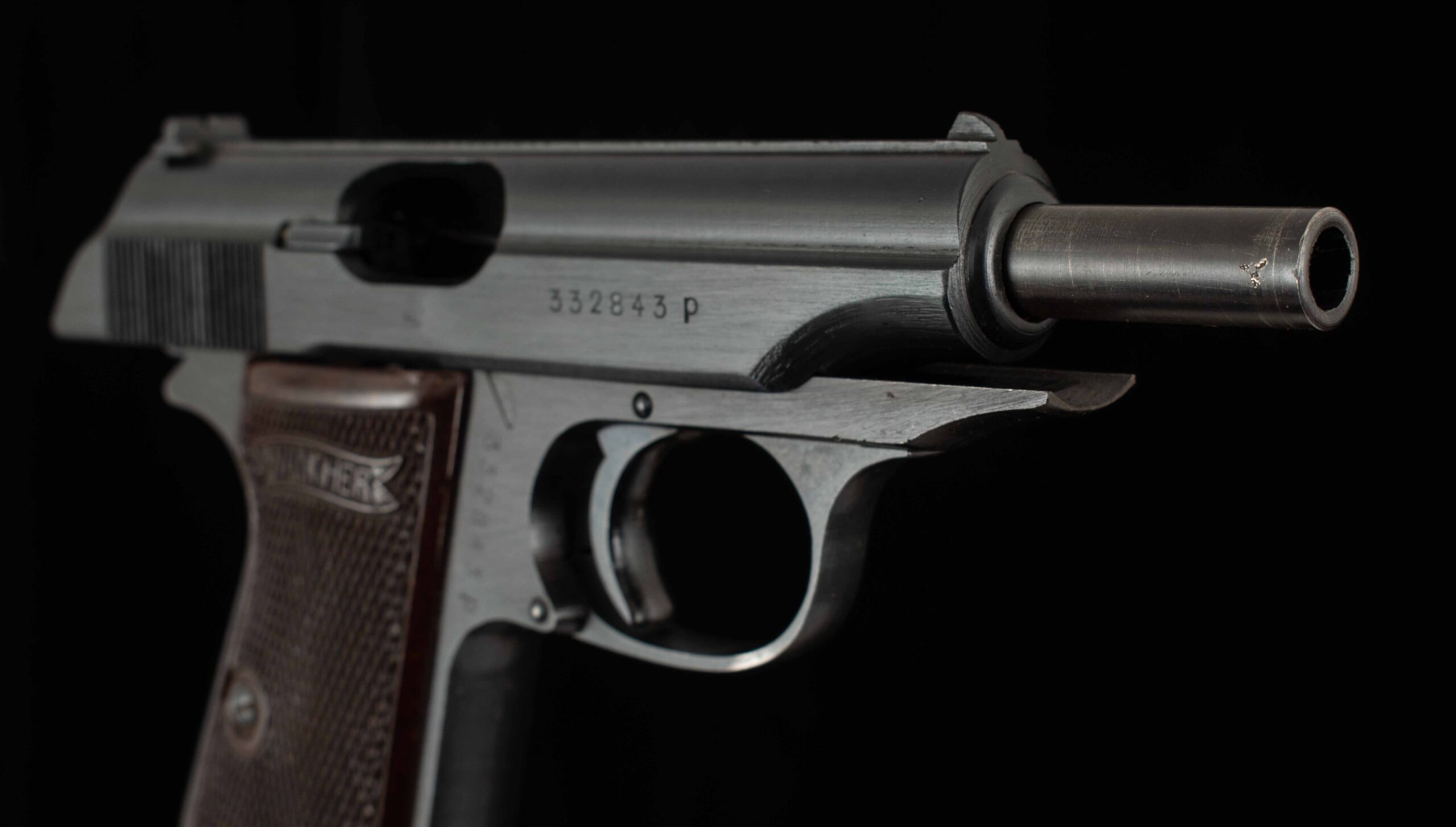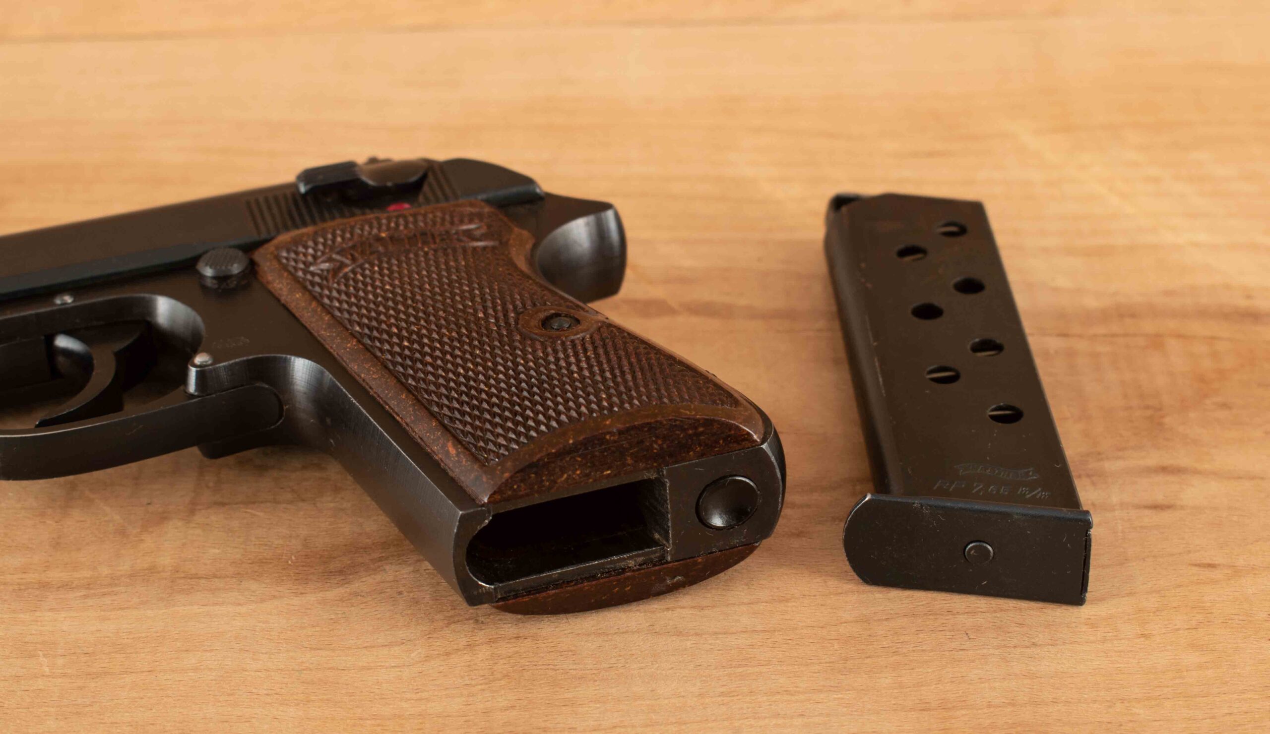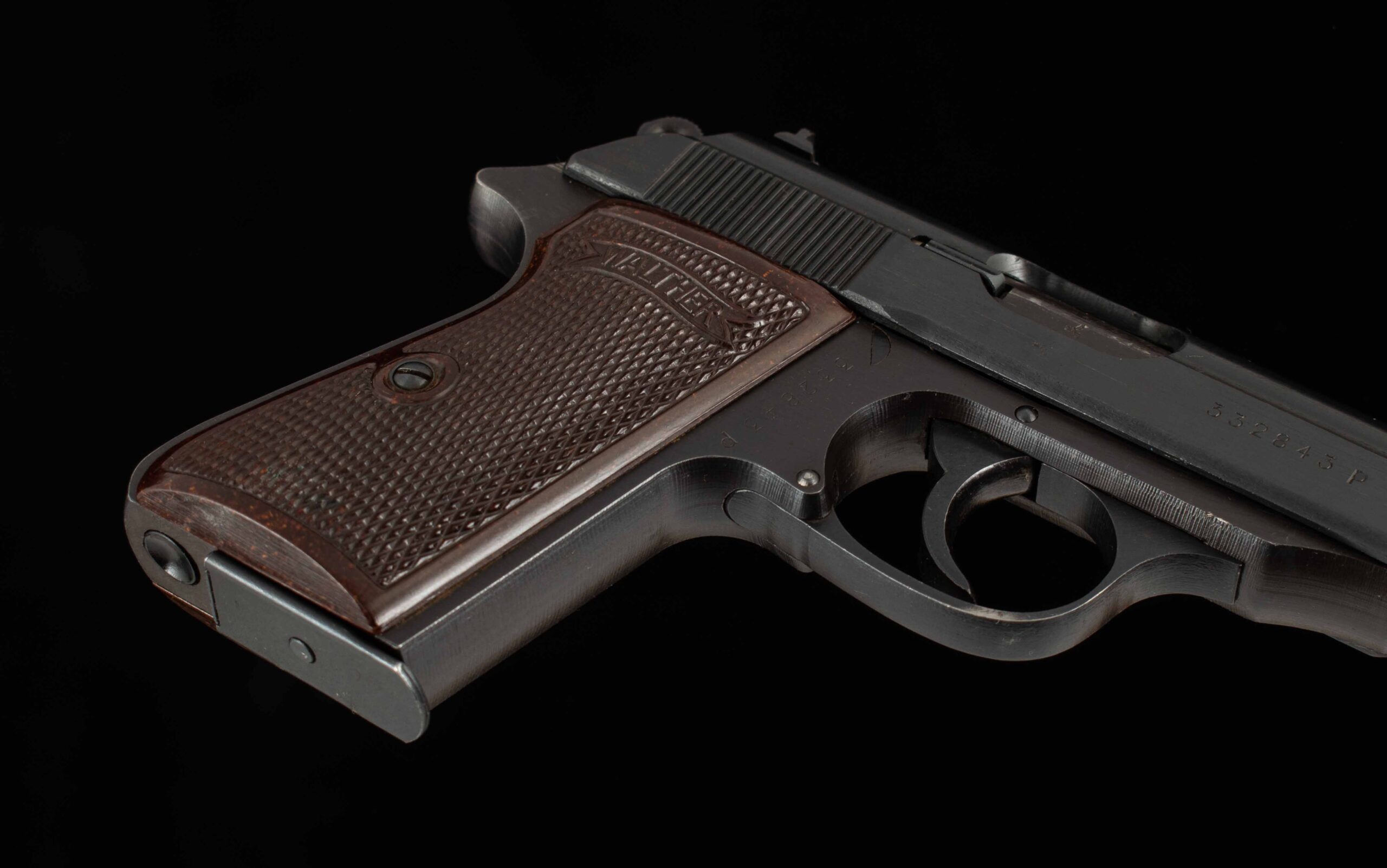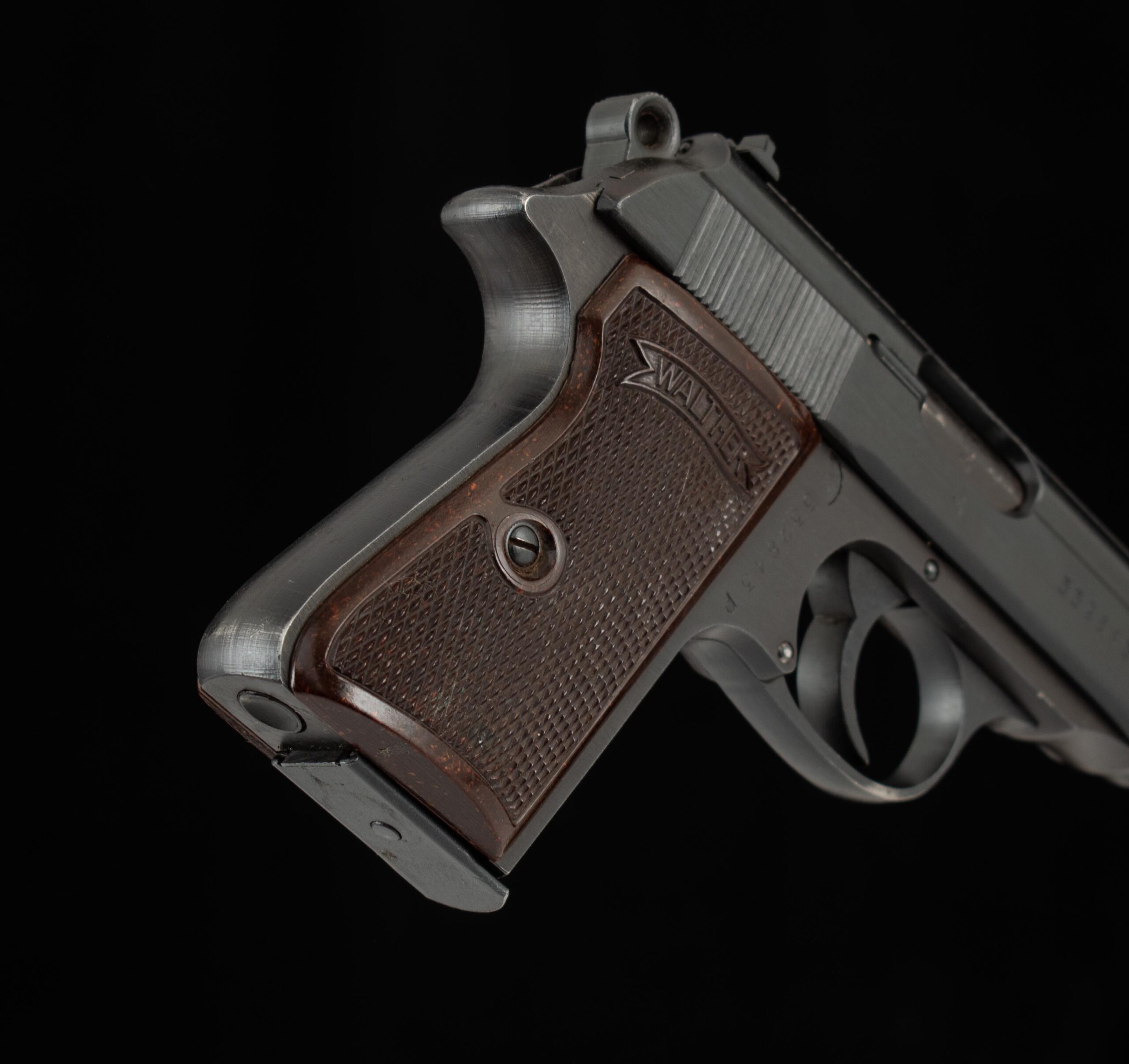 | General Specs: Walther, 1944, 7.65mm,23oz., Barrel 3 7/8″ Serial Number: 332843P The PP is a double action/single action hammer fired gun. The PP (Polizei pistole, or police pistol) was introduced in 1929. It is one of the world’s iconic designs and is still in production. This example serial number 332843P was manufactured in 1944. It has all matching serial numbers and the Waffenamt code WaA359 and clear acceptance stamps on the slide, barrel hood and muzzle, it has a mirror bore, Bakelite grips and 99% factory finishes. We have never seen a Walther PP war time issue in such mint condition, this is a rare chance to own this remarkable gun, it has one magazine. Vintage Firearms provides the most thorough photos, description, and specifications in the industry, providing you all the information you need to make a wise purchase. Don’t hesitate to make the call and put this gun in your collection. The specifications are shown below. Thanks for looking!