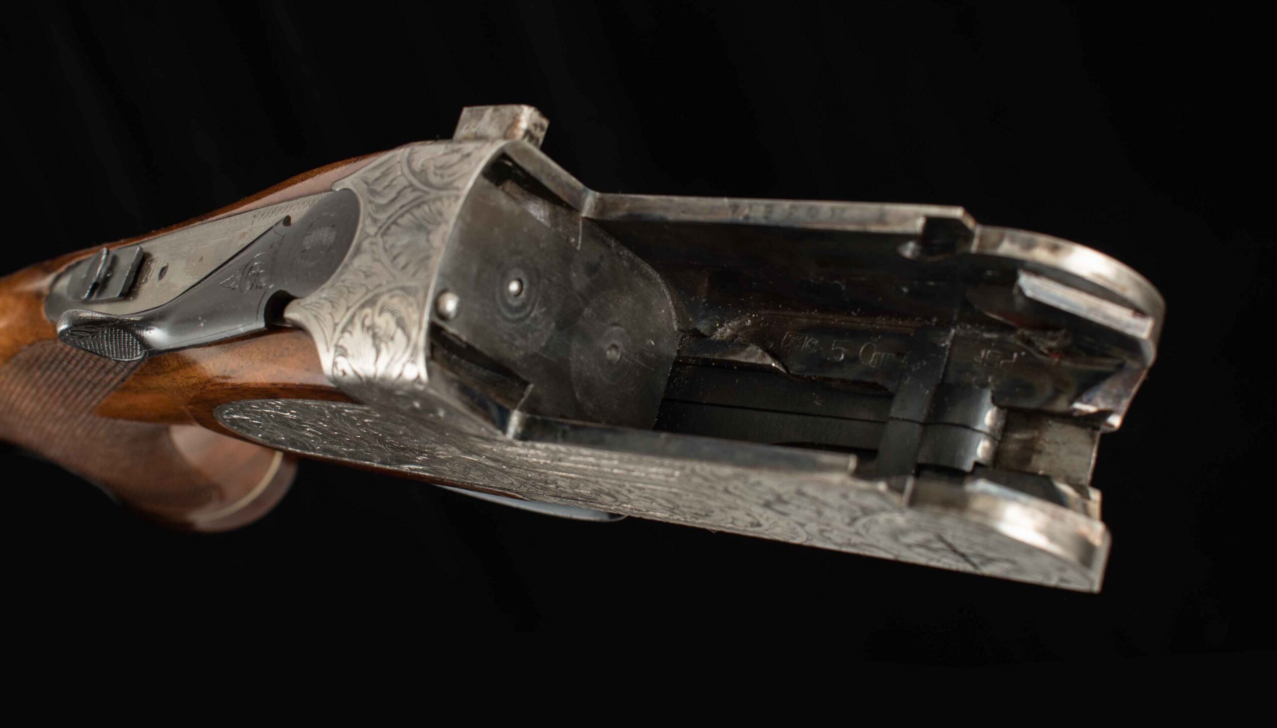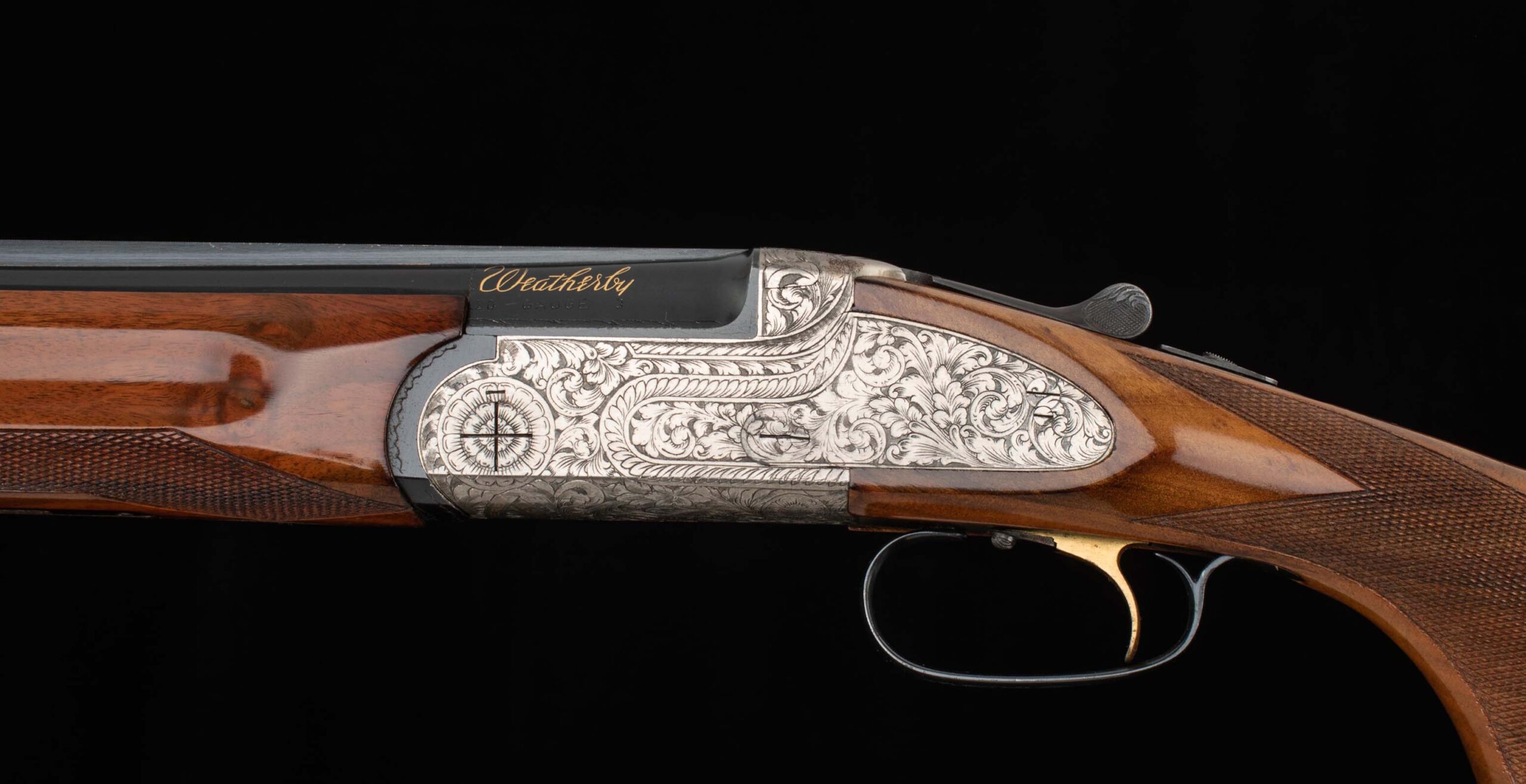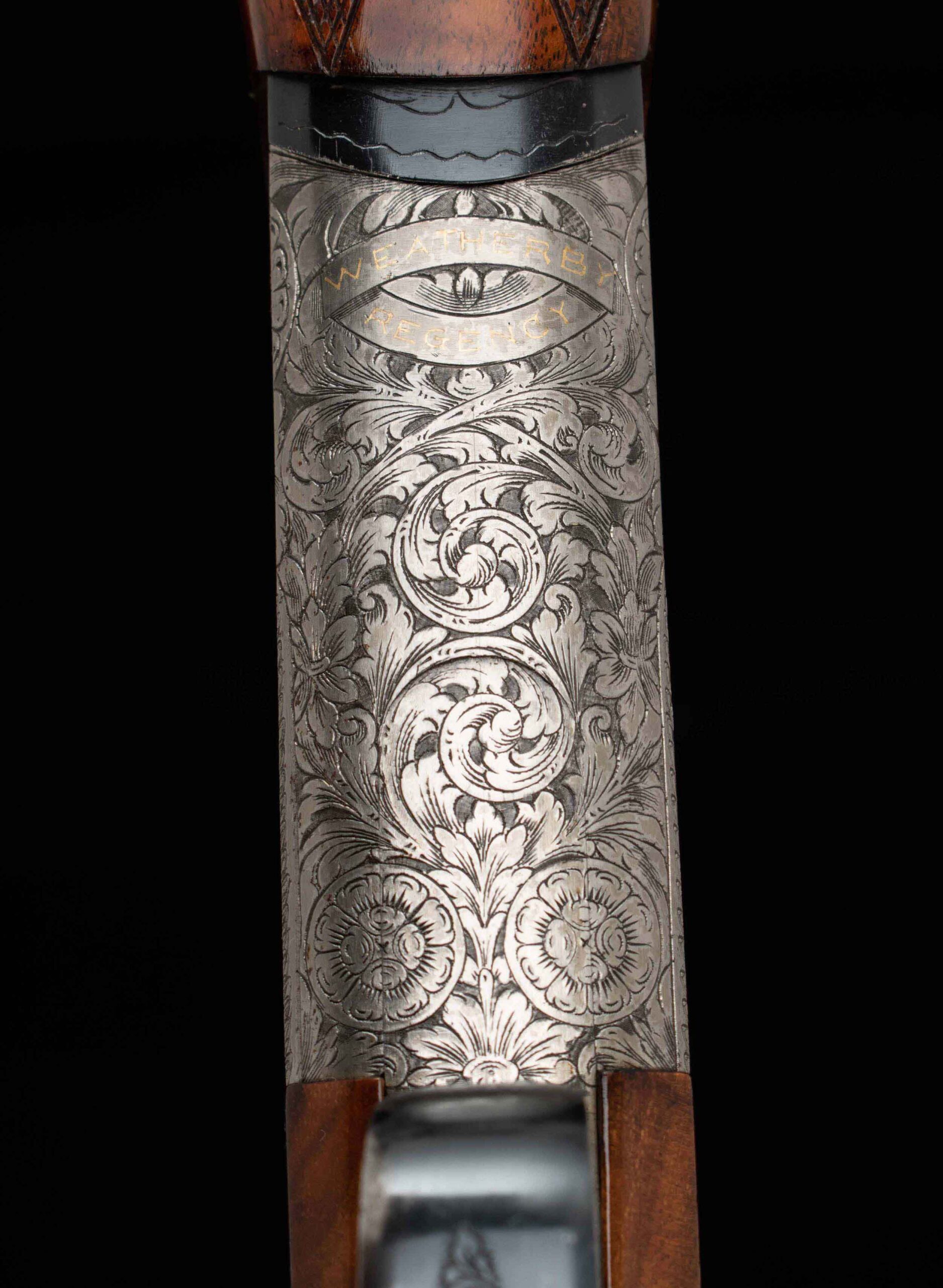 Vintage Firearms is pleased to present this Italian made and handsomely engraved Weatherby Regency.  At first look, I thought, this is a Seventies gun, and sure enough, after speaking with the folks at Weatherby, it was made in 1974.  Gold details are found in a few key spots to give that swanky panache – beginning with an inlay on the chamber announcing the brand, the selective trigger, forend release lever, and another inlay of the brand and model on the bottom of the frame compliment the overall rich golden hues of the beautiful wood stock and forend.