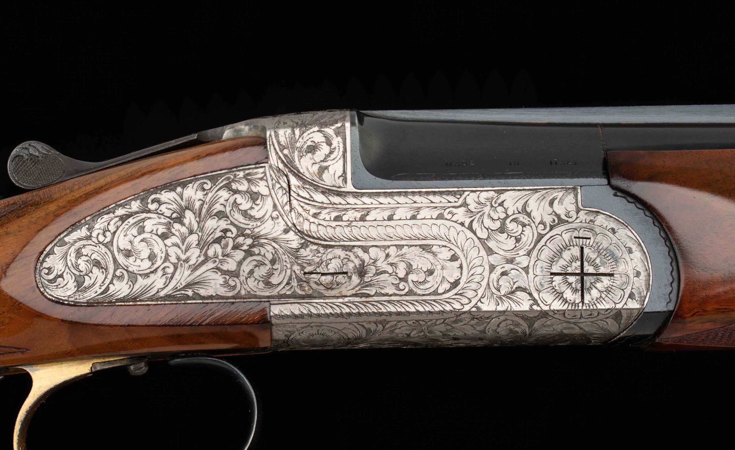 Engraving:   Deep Floral, hand engraved, gold inlay on lettering