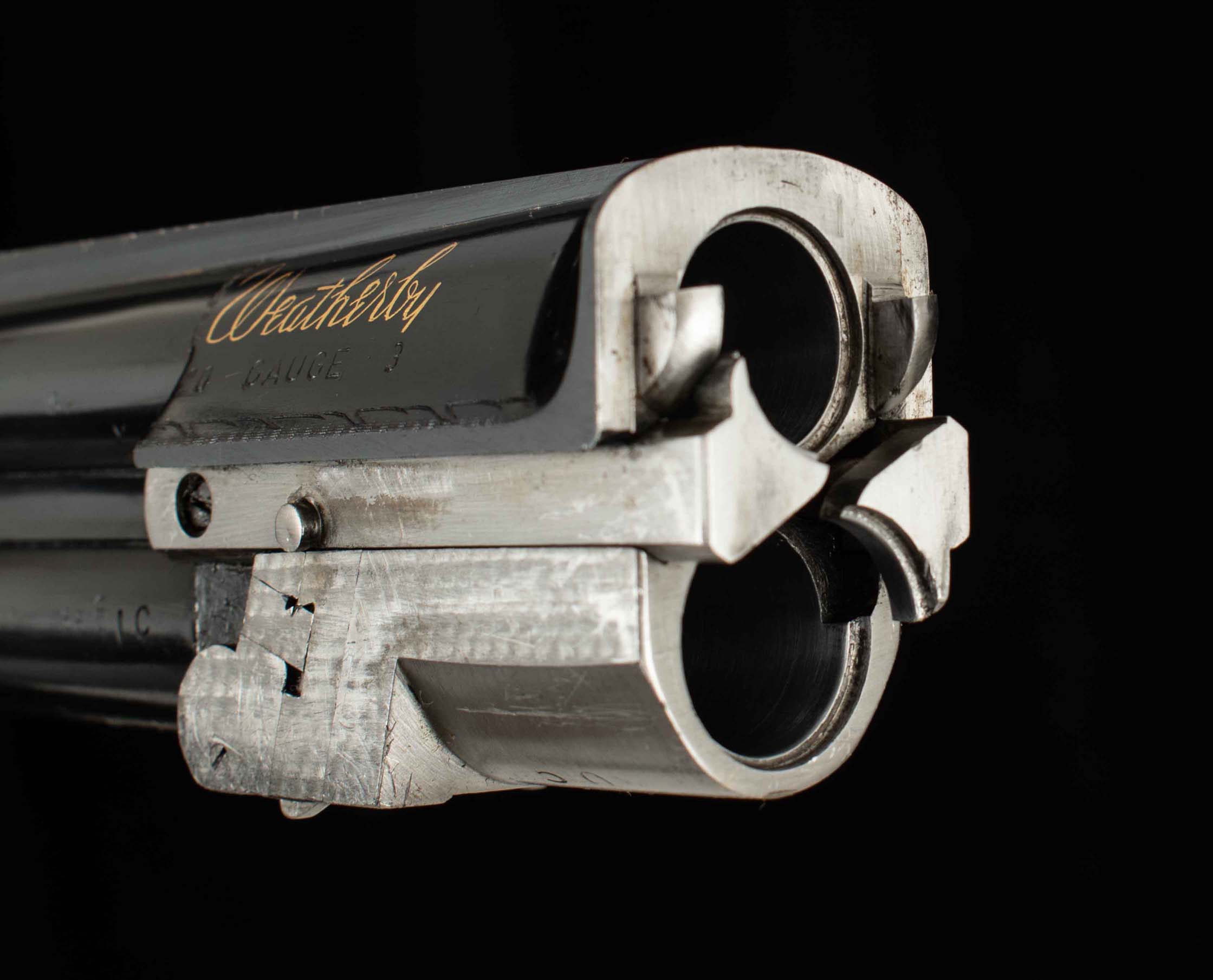 The 28” barrels have excellent bluing with some of the expected light wear with bores that are a 9.5 of 10.  The ventilated narrow rib has some evidence of light rust. The receiver and sideplates have deep floral engraving, excellent screws, and a secure locking crossbolt closure.  The floral and checker engraved lever lands just right of center above a simple tang safety.  The wood has beautiful figure, and the finish hides well the few light handling marks that are present.  The checkering is comfortable and rates a 9.5 out of 10. The handsome pistol grip cap and recoil pad are both classic Weatherby-style.