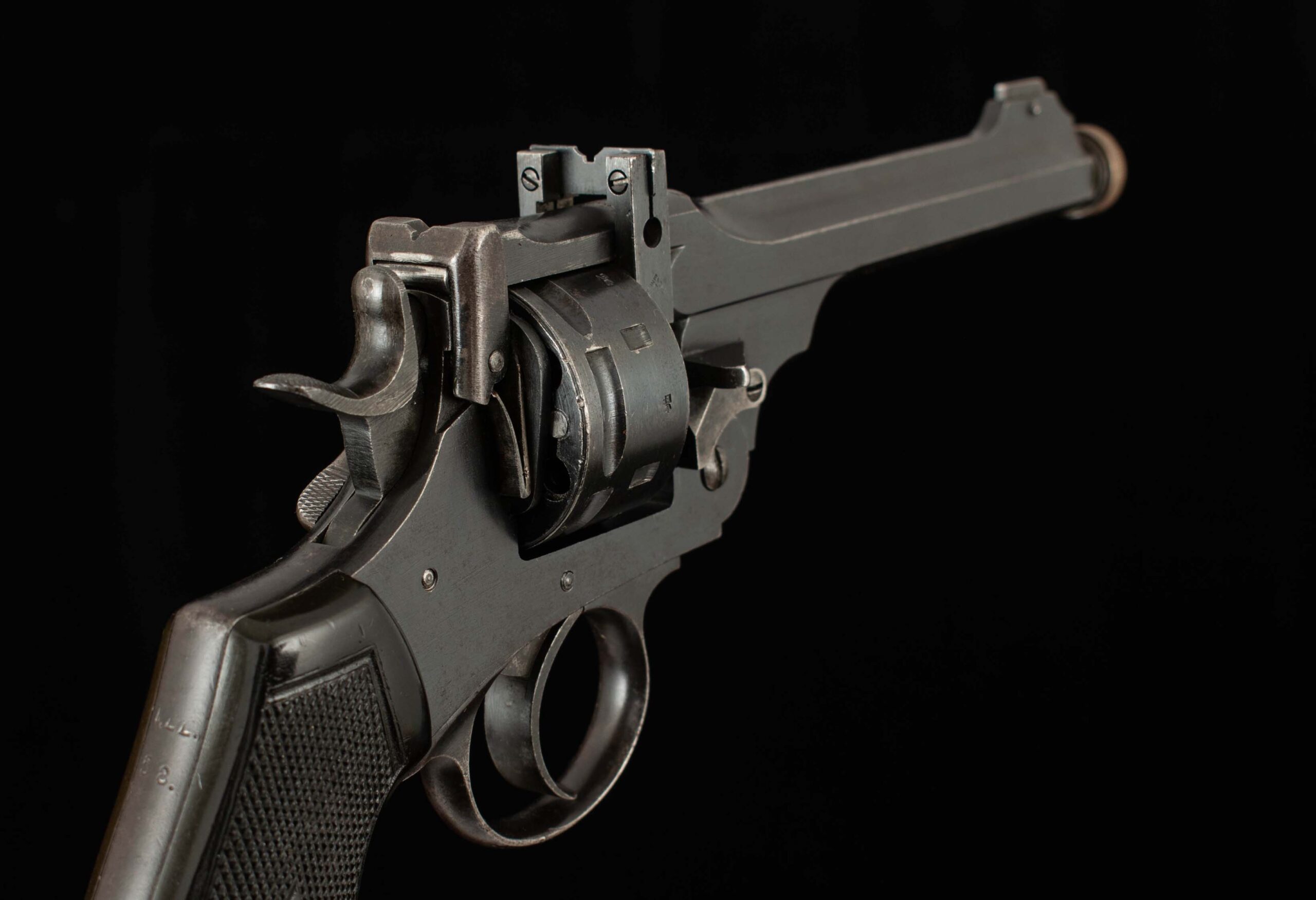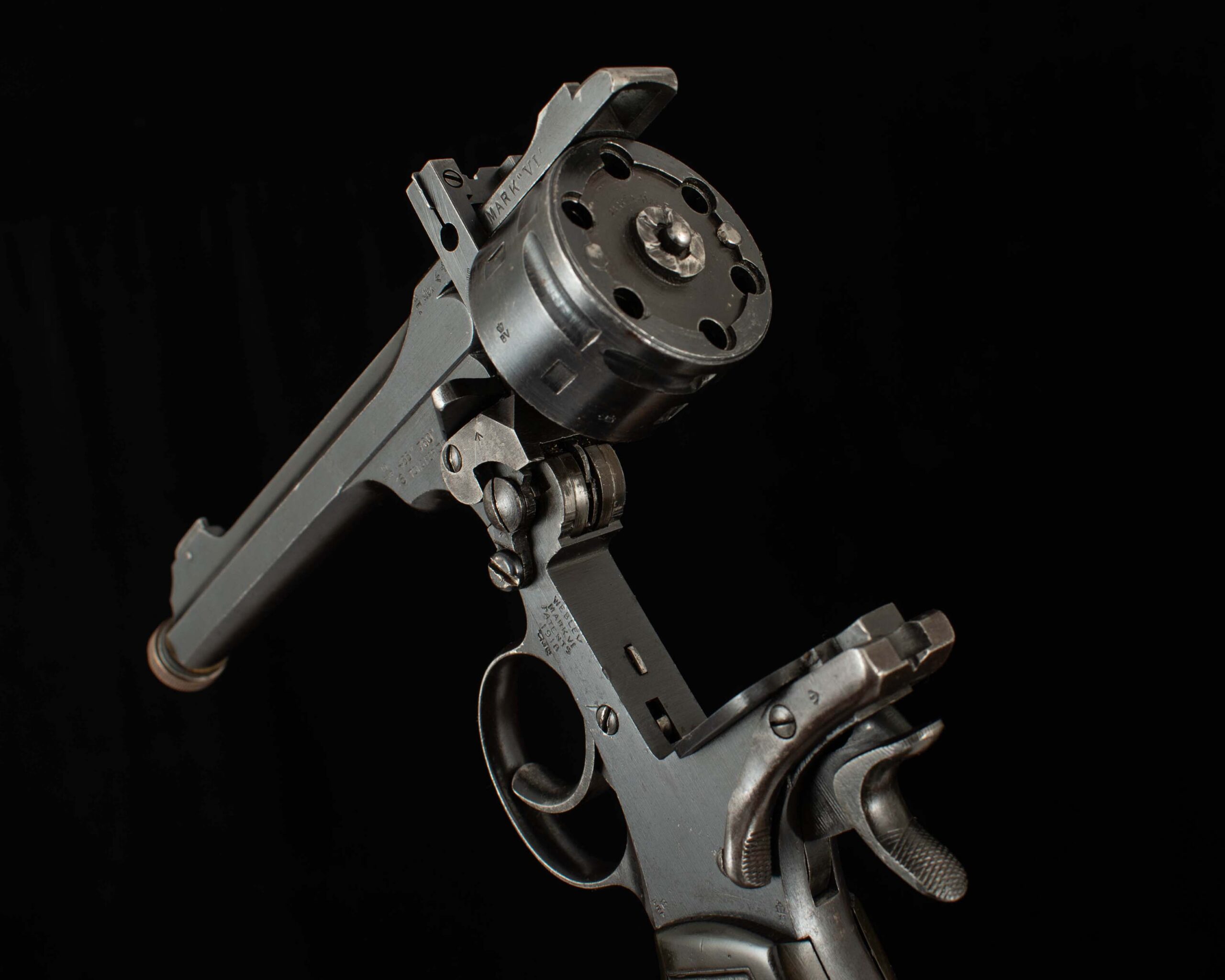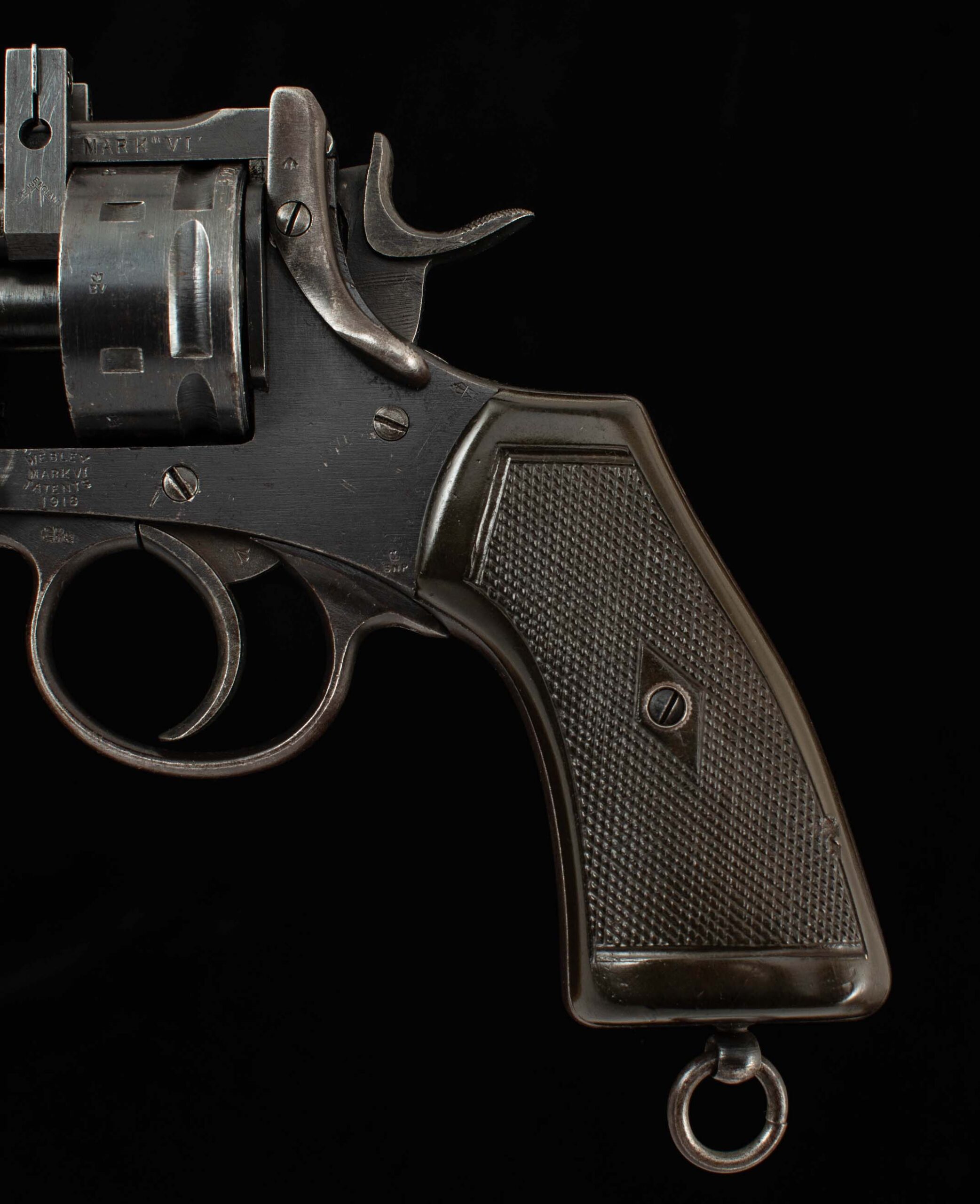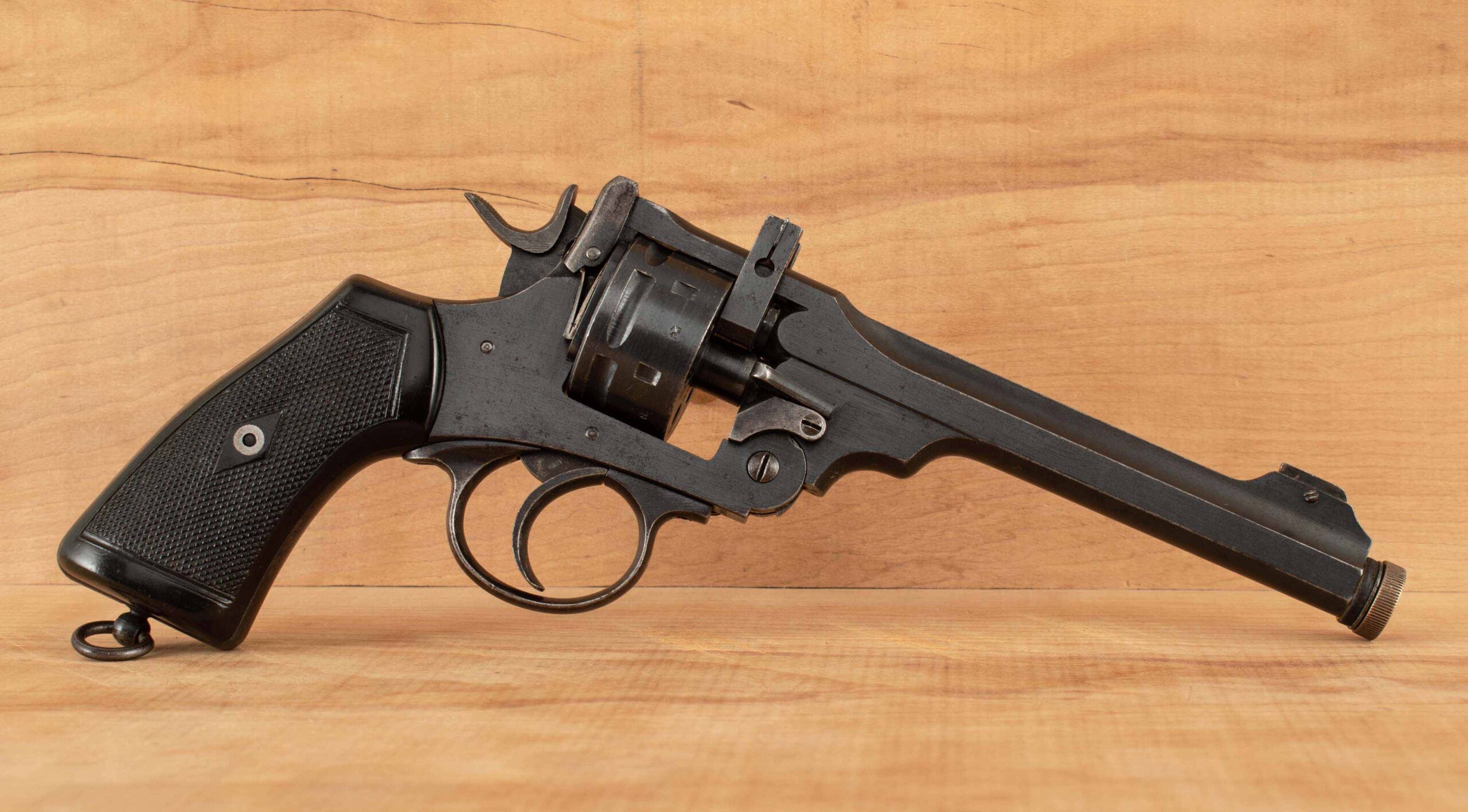 | General Specs: Webley & Scott, c1918, .22 Long Rifle, 43oz. 6 7/8″ Serial Number: 349422 Vintage Firearms is pleased to offer this unique British revolver conversion; the Webley revolver was adopted as the British service revolver in 1887 and served that role until 1963. The Mk VI was adopted in 1915 and served with distinction throughout The Great War. The Webley Revolvers earned the moniker of the “Webley Self-Extracting Revolver” for its top break action which ejects spent casings, thus quickening reloads. This example, serial number 349422 was manufactured circa 1918, is equipped with a Parker-Hale cylinder and “Parkerfield” rifled liner, which converts the Webley to fire .22 long rifle. Originally chambered in .455 caliber, some guns were later converted to .22LR for lower cost training although the recruit would still qualify with the full power cartridge. This Mk VI is in great overall condition, displaying excellent-shiny bores with strong rifling. The barrel and frame show 96% factory finish. The frame, barrel and cylinder have matching serial numbers, and military broad arrows signifying government ownership, with the gun well covered in acceptance stamps – as is the British fashion! This is a rare and seldom seen conversion, if you have a Webley collection or just starting one this historical gun would make a great center piece. A great choice for World War 1 collectors or those who just like unique revolvers. Vintage Firearms provides the most thorough photos, description, and specifications in the industry, providing you all the information you need to make a wise purchase. Don’t hesitate to make the call and put this gun in your collection. The specifications are shown below. Thanks for looking!