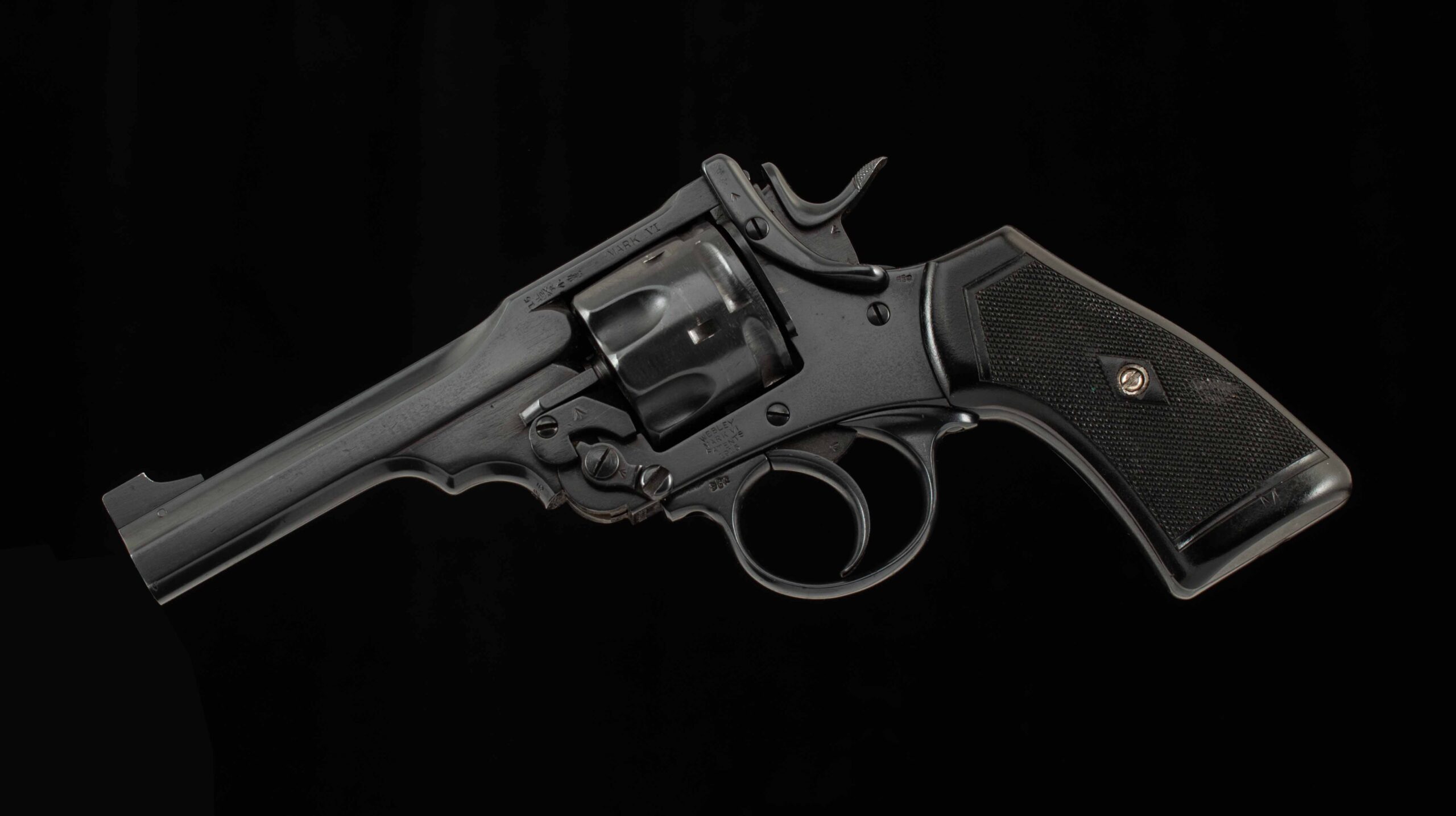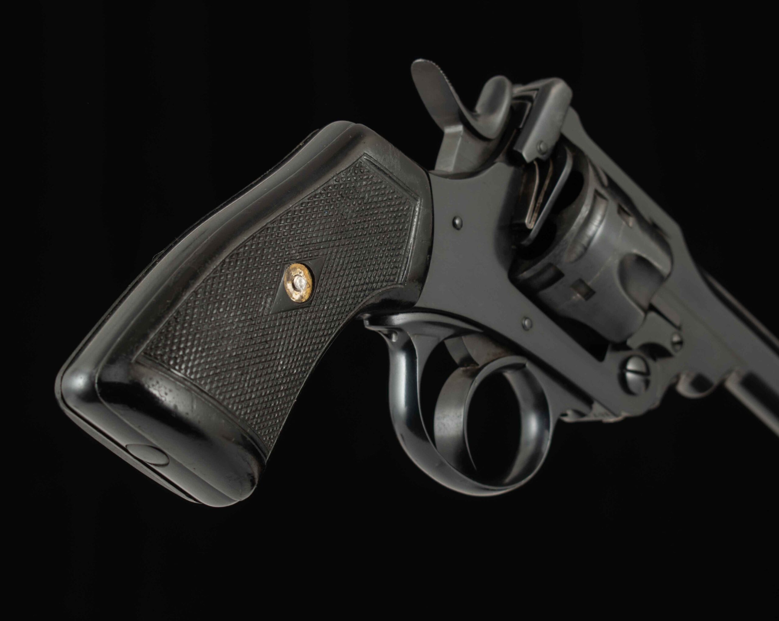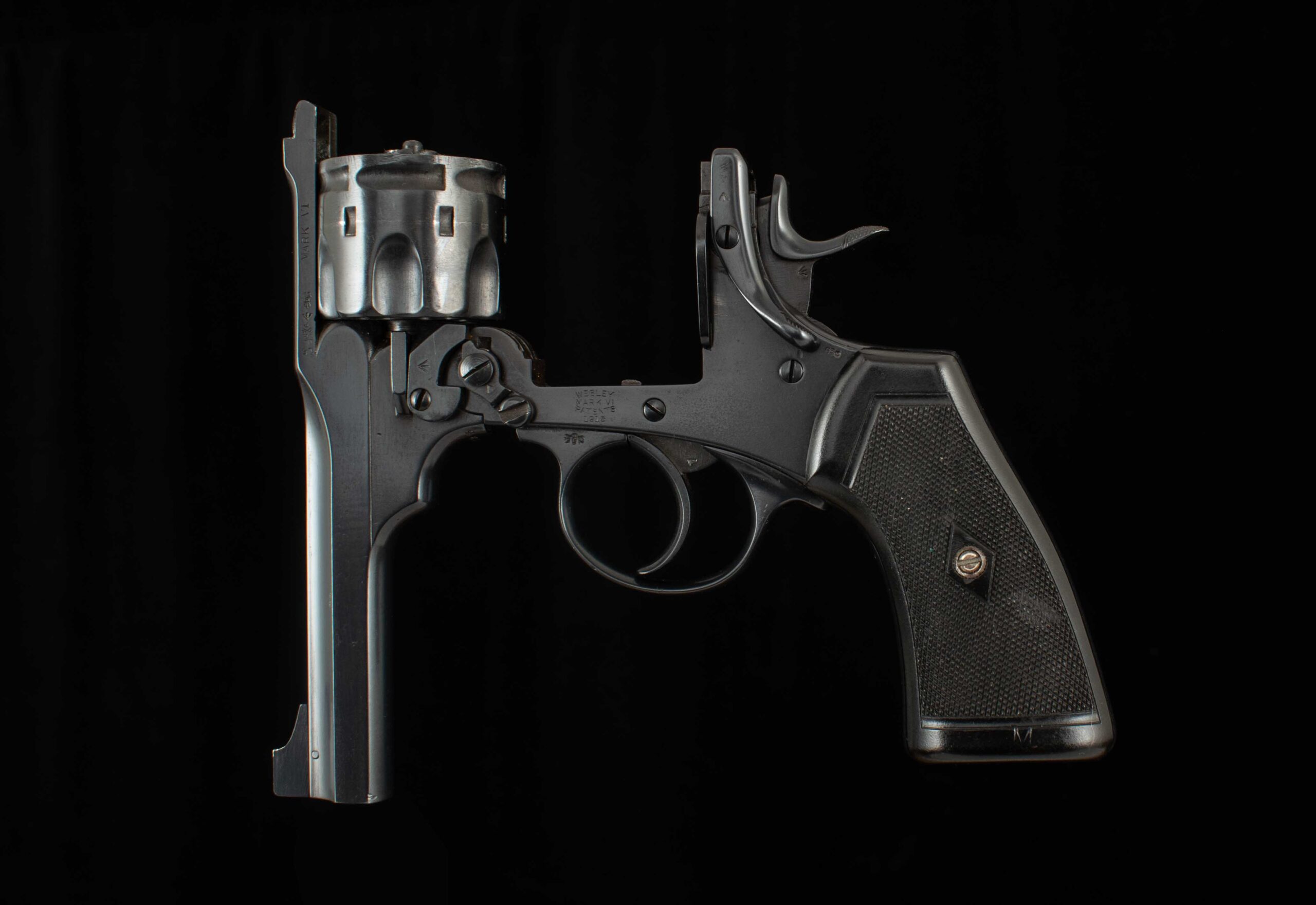 | General Specs: Webley & Scott, c1915, .455, 35.4oz, 4 1/2″ Serial Number: 157225 Vintage Firearms is pleased to offer this unique British revolver; the Webley revolver was adopted as the British service revolver in 1887 and served that role until 1963. The Mk VI was adopted in 1915 and served with distinction throughout The Great War. The Webley Revolvers earned the moniker of the “Webley Self-Extracting Revolver” for its top break action which ejects spent casings, thus quickening reloads. This example, serial number 157225, produced circa 1915, has been professionally restored, and retains 99% finish, and sports a shiny mirror bore with strong rifling. The frame, barrel and cylinder all have matching serial numbers, and military broad arrows signifying government ownership, with the gun well covered in acceptance stamps – as is the British fashion! This Mk VI comes with a 1953 British Canvas holster to keep your revolver right where you want it! A great choice for militaria collectors or those who just like unique revolvers. Vintage Firearms provides the most thorough photos, description, and specifications in the industry, providing you all the information you need to make a wise purchase. Don’t hesitate to make the call and put this gun in your collection. The specifications are shown below. Thanks for looking!