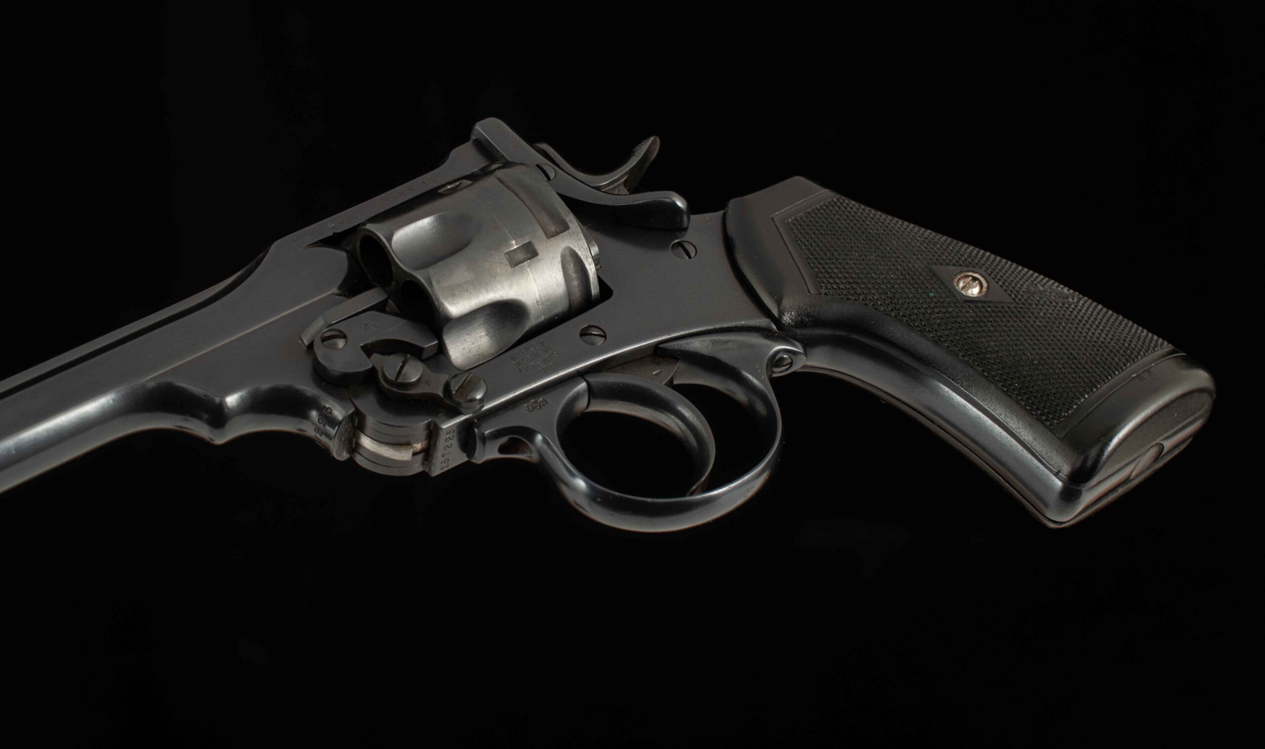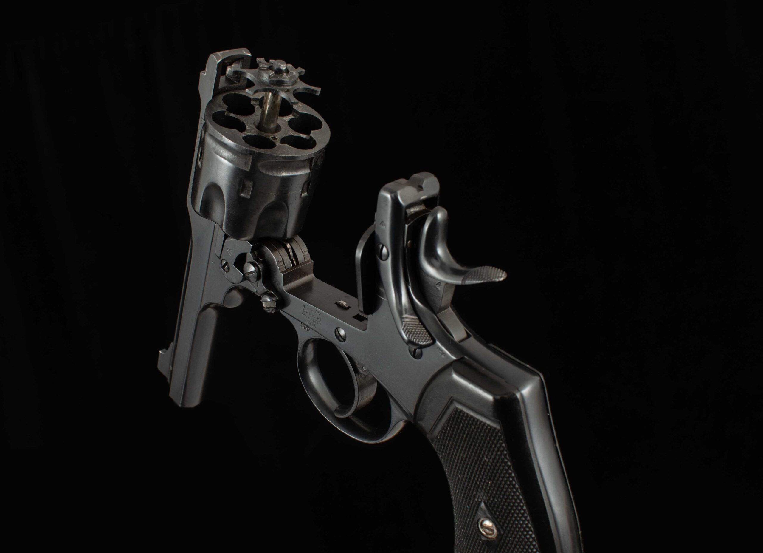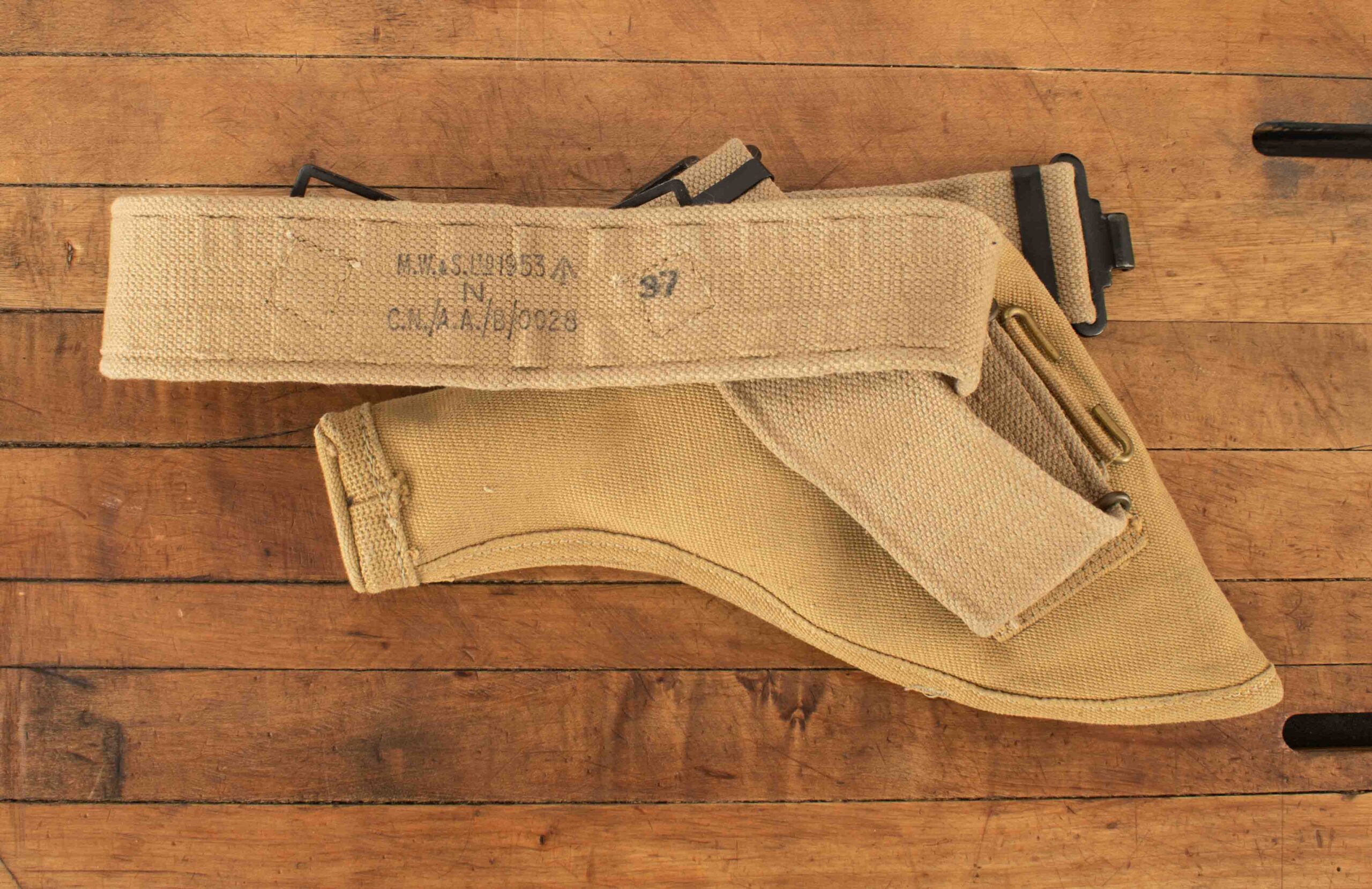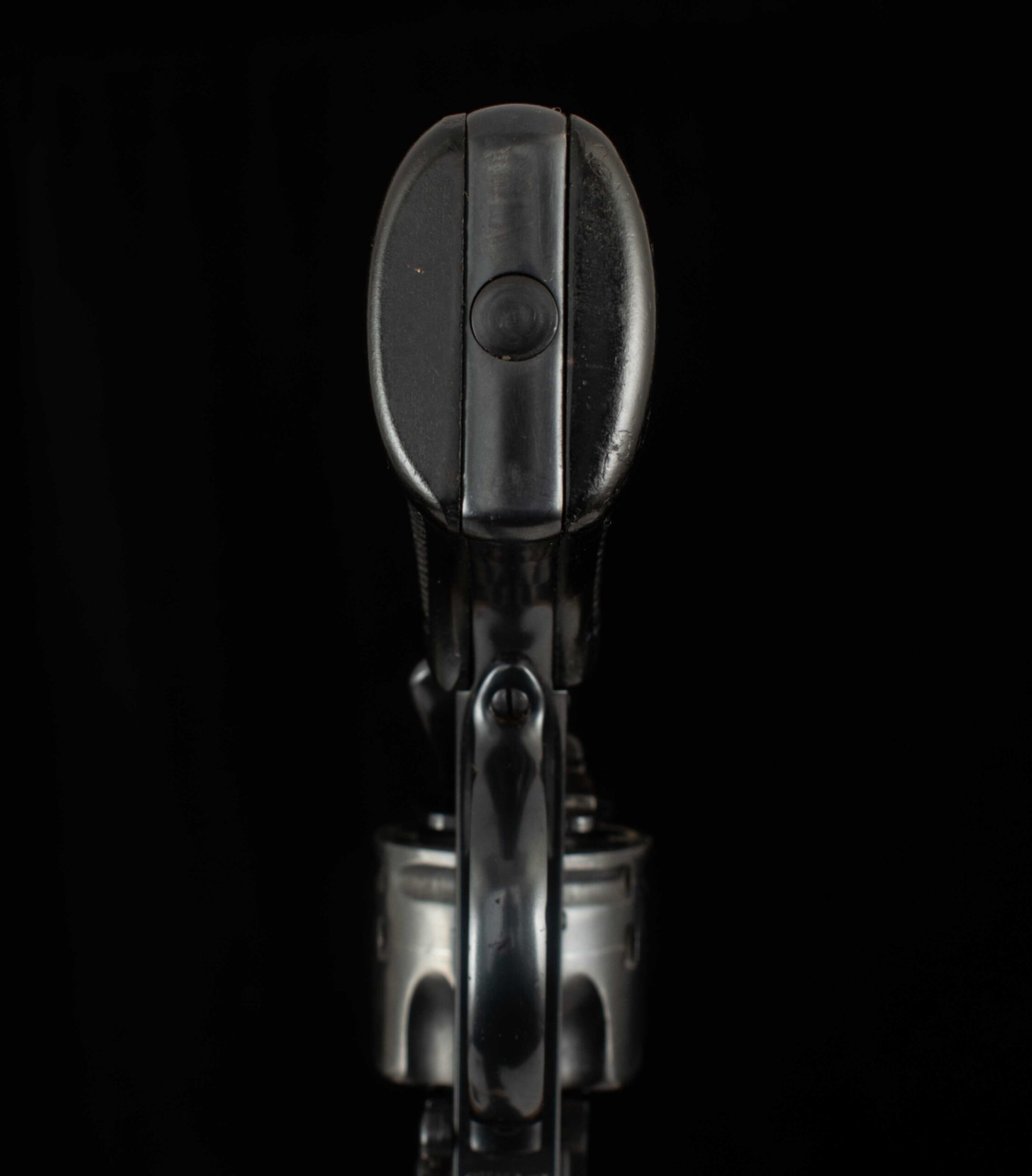 | General Specs: Webley & Scott, c1915, .455, 35.4oz, 4 1/2″ Serial Number: 157225 Vintage Firearms is pleased to offer this unique British revolver; the Webley revolver was adopted as the British service revolver in 1887 and served that role until 1963. The Mk VI was adopted in 1915 and served with distinction throughout The Great War. The Webley Revolvers earned the moniker of the “Webley Self-Extracting Revolver” for its top break action which ejects spent casings, thus quickening reloads. This example, serial number 157225, produced circa 1915, has been professionally restored, and retains 99% finish, and sports a shiny mirror bore with strong rifling. The frame, barrel and cylinder all have matching serial numbers, and military broad arrows signifying government ownership, with the gun well covered in acceptance stamps – as is the British fashion! This Mk VI comes with a 1953 British Canvas holster to keep your revolver right where you want it! A great choice for militaria collectors or those who just like unique revolvers. Vintage Firearms provides the most thorough photos, description, and specifications in the industry, providing you all the information you need to make a wise purchase. Don’t hesitate to make the call and put this gun in your collection. The specifications are shown below. Thanks for looking!