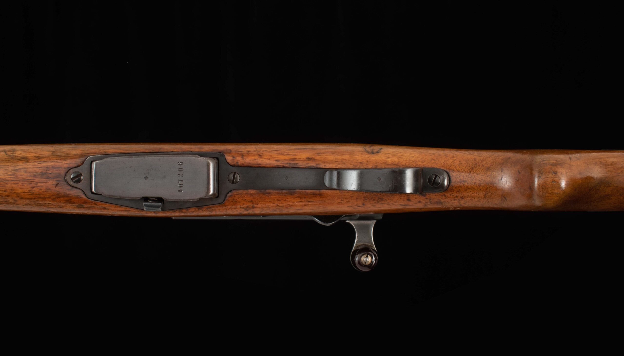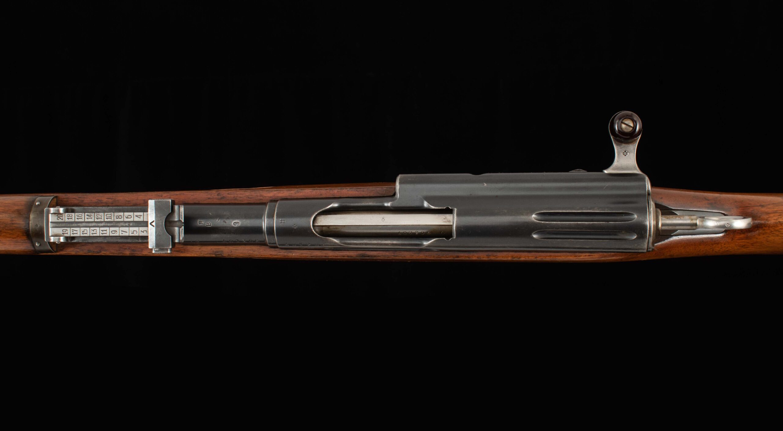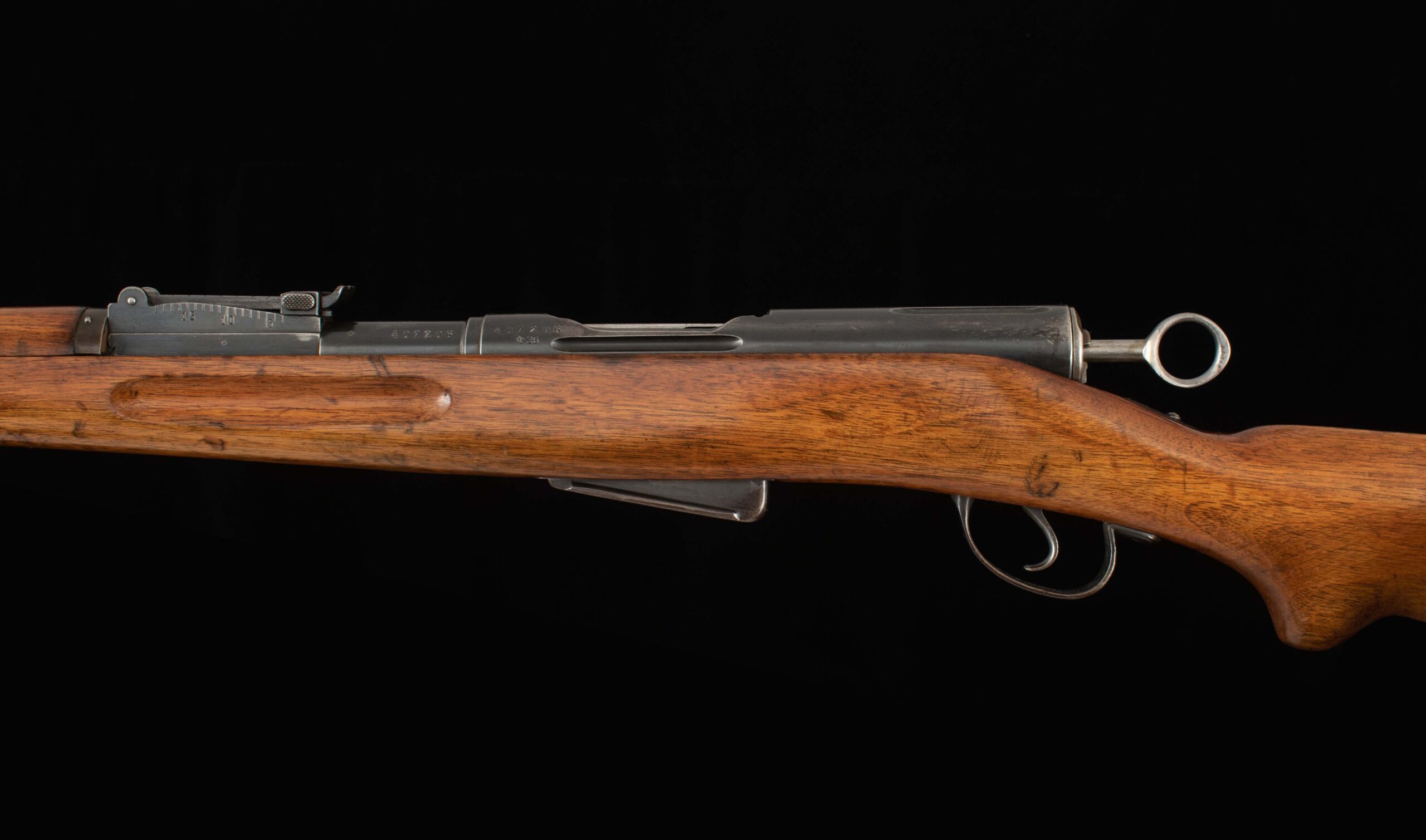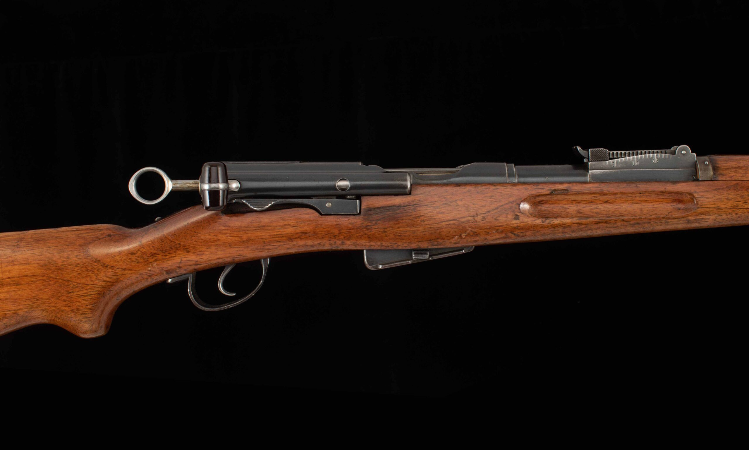 Vintage Firearms is pleased to offer a wonderful Schmidt-Rubin rifle, designed by Eduard Rubin and Rudolph Schmidt and produced by Waffenfabrik Bern to serve as the service rifle for the Swiss Armed Forces. The rifle features a unique straight pull bolt action which unlocks the action, cocks the striker, ejects the spent casing and then chambers the next round, and locks the action all in one fluid pull/push movement. The earlier Schmidt-Rubin models were chambered for 7.7×53.5mm Swiss but the 1911 models improved upon the action by changing the placement of the locking lugs allowing for more powerful cartridges to be used, allowing for the Model 1911 to be chambered in the more powerful GP 11 cartridge, more commonly known as 7.7x55mm Swiss. This example, serial number 407206, manufactured in 1916 by Waffenfabrik Bern. It features a 31” barrel which retains 99% factory finish and has a mirror 10/10 bore. The receiver retains 97% factory finish, and trigger guard retains 99% factory finish. This rifle also comes with its correct sling. Overall, a unique Swiss bolt-action with some history, a great choice for any militaria collector. Have a look at the detailed specifications and pictures below.