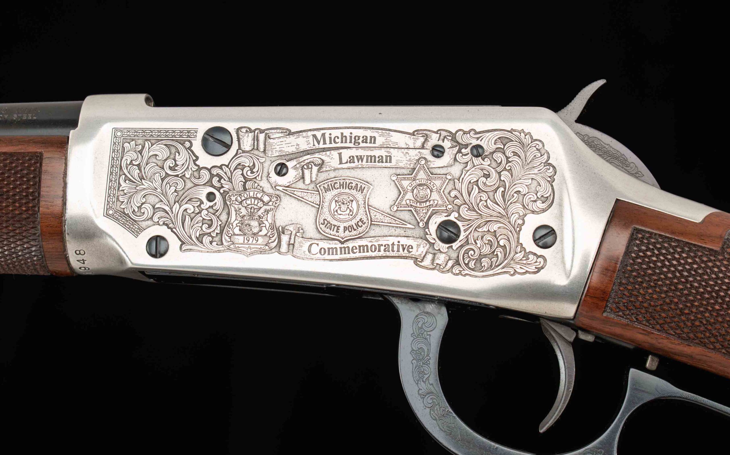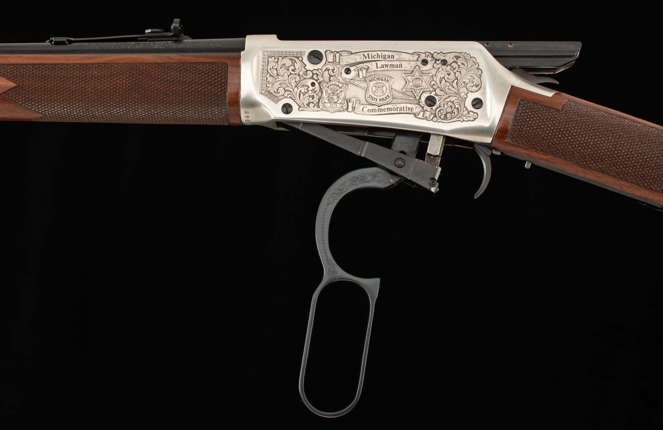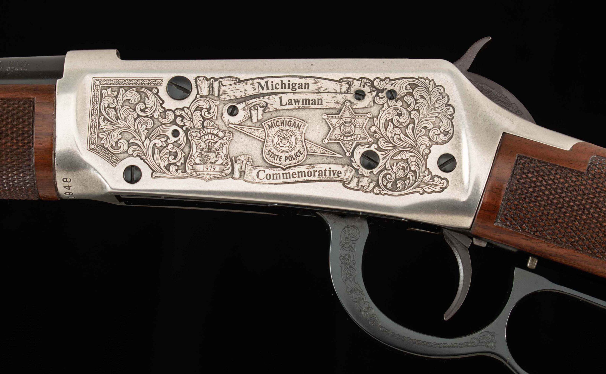 Vintage Firearms is pleased to offer the Winchester Model 94 XTR “Michigan Lawman Commemorative” .30-30 rifle, produced in 1979, under a very limited production run. Featuring a 20-inch blued barrel, gold (or the rarely seen silver) plated receiver, lever, hammer, trigger guard, and barrel bands. All of which is adorned with fine checkered walnut furniture and intricate Michigan-themed engravings, floral scrollwork, state police insignias, badges, and the outline of Michigan itself. The left side of the receiver bears the inscription “Michigan Lawman Michigan State Police Commemorative,” while the right-side reads “ONE OF ONE THOUSAND,” indicating its limited production. Equipped with a hooded front sight and adjustable rear sight, and full-length magazine tube. This still and 94 and thus, the XTR models are distinguished by their premium features, including a deep blue finish and a checkered walnut stock and forend. This example plated in silver, much rarer than the gold plated!!! is in 99.5% factory condition, comes with its box and associated paperwork, and is unfired!!! Of the one thousand Michigan Lawman 94 XTR rifles ever made, only a handful were produced with factory silver plating. A great collection addition for the die-hard Winchester commemorative collector or just someone looking for the crown jewel for their lever gun display. We at Vintage Firearms invite you to have a look at the detailed specifications and pictures below. Thanks for looking!