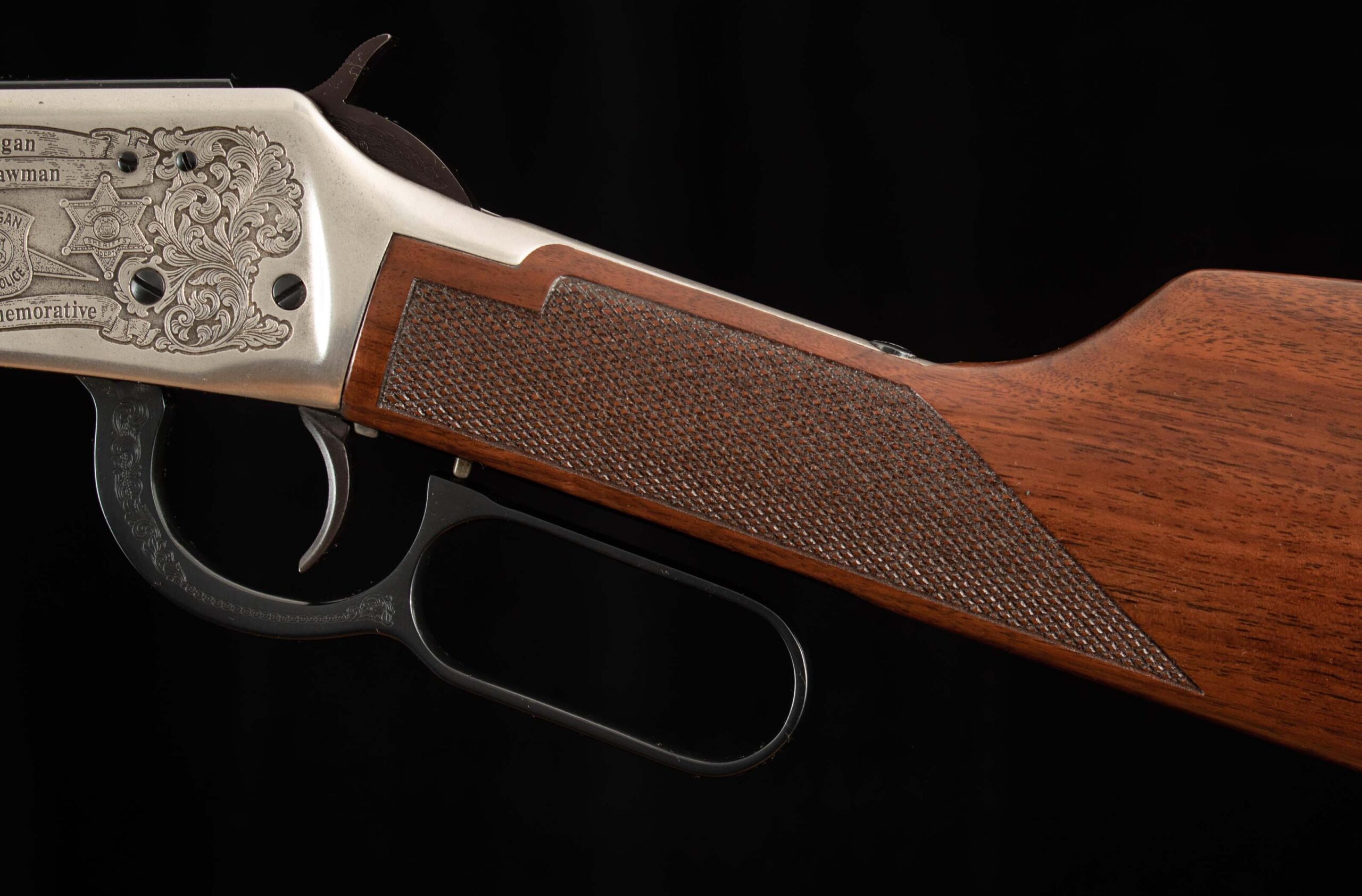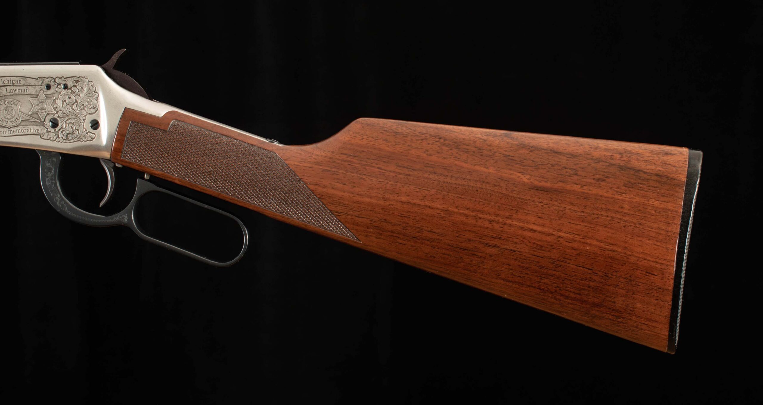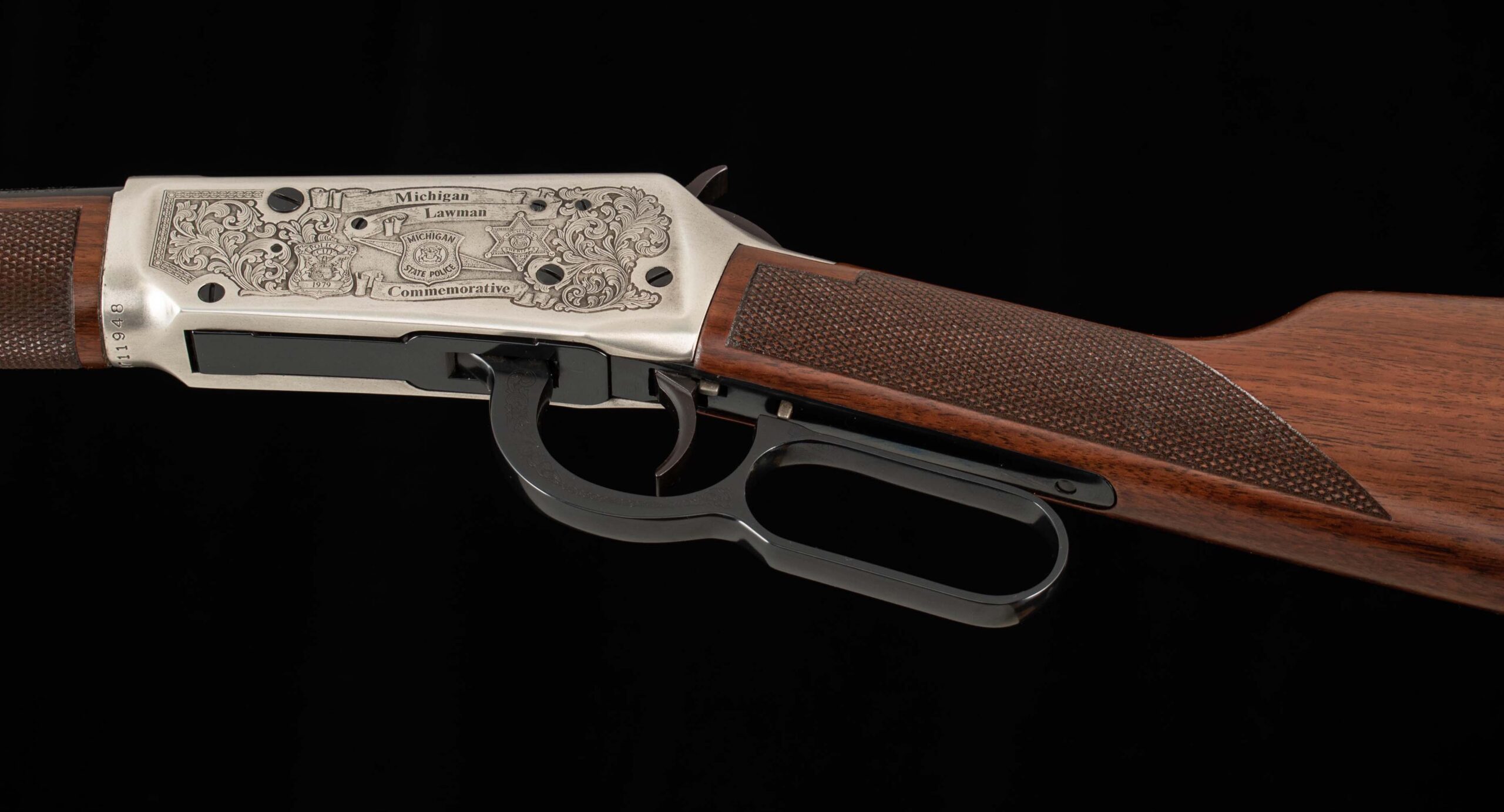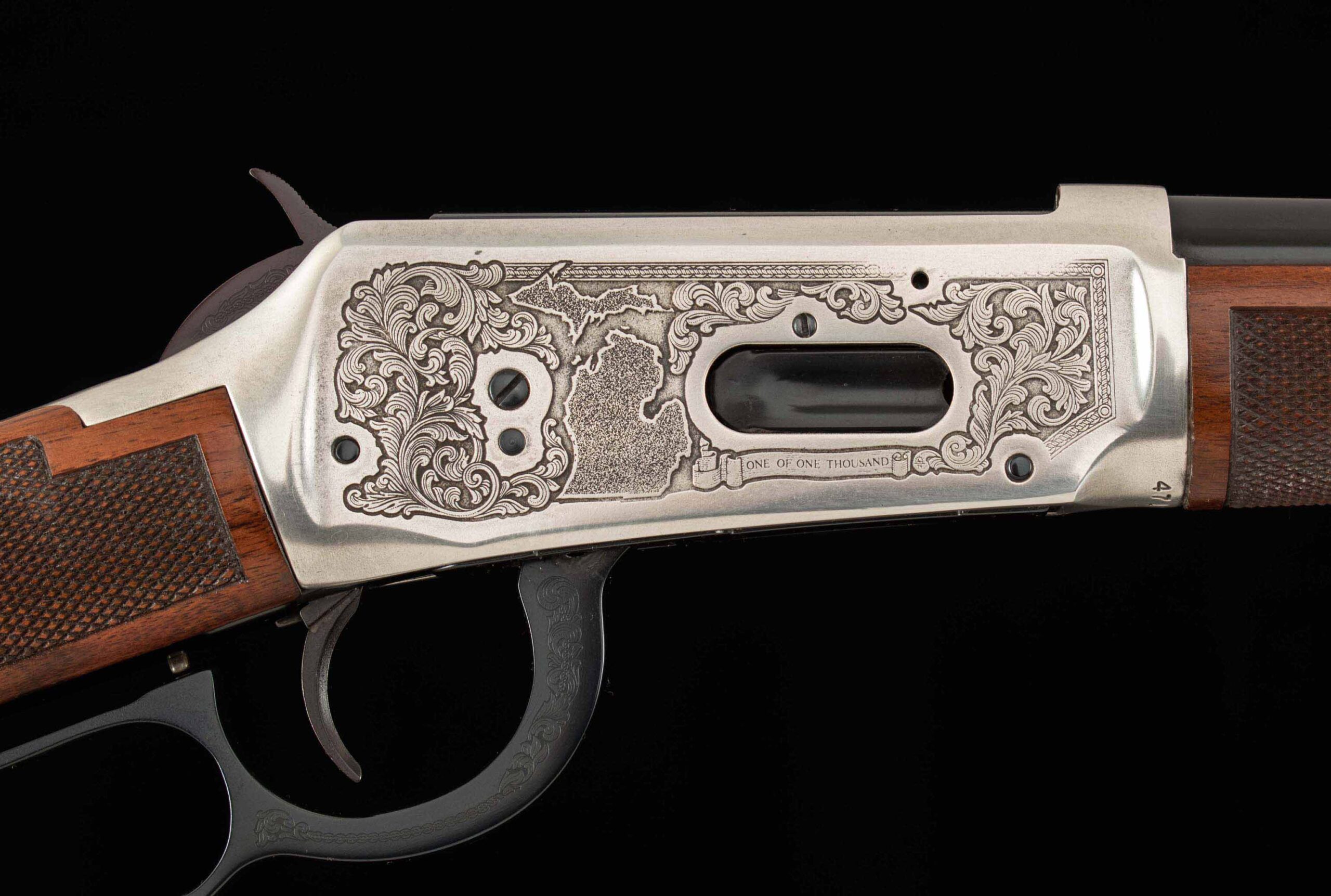 Vintage Firearms is pleased to offer the Winchester Model 94 XTR “Michigan Lawman Commemorative” .30-30 rifle, produced in 1979, under a very limited production run. Featuring a 20-inch blued barrel, gold (or the rarely seen silver) plated receiver, lever, hammer, trigger guard, and barrel bands. All of which is adorned with fine checkered walnut furniture and intricate Michigan-themed engravings, floral scrollwork, state police insignias, badges, and the outline of Michigan itself. The left side of the receiver bears the inscription “Michigan Lawman Michigan State Police Commemorative,” while the right-side reads “ONE OF ONE THOUSAND,” indicating its limited production. Equipped with a hooded front sight and adjustable rear sight, and full-length magazine tube. This still and 94 and thus, the XTR models are distinguished by their premium features, including a deep blue finish and a checkered walnut stock and forend. This example plated in silver, much rarer than the gold plated!!! is in 99.5% factory condition, comes with its box and associated paperwork, and is unfired!!! Of the one thousand Michigan Lawman 94 XTR rifles ever made, only a handful were produced with factory silver plating. A great collection addition for the die-hard Winchester commemorative collector or just someone looking for the crown jewel for their lever gun display. We at Vintage Firearms invite you to have a look at the detailed specifications and pictures below. Thanks for looking!